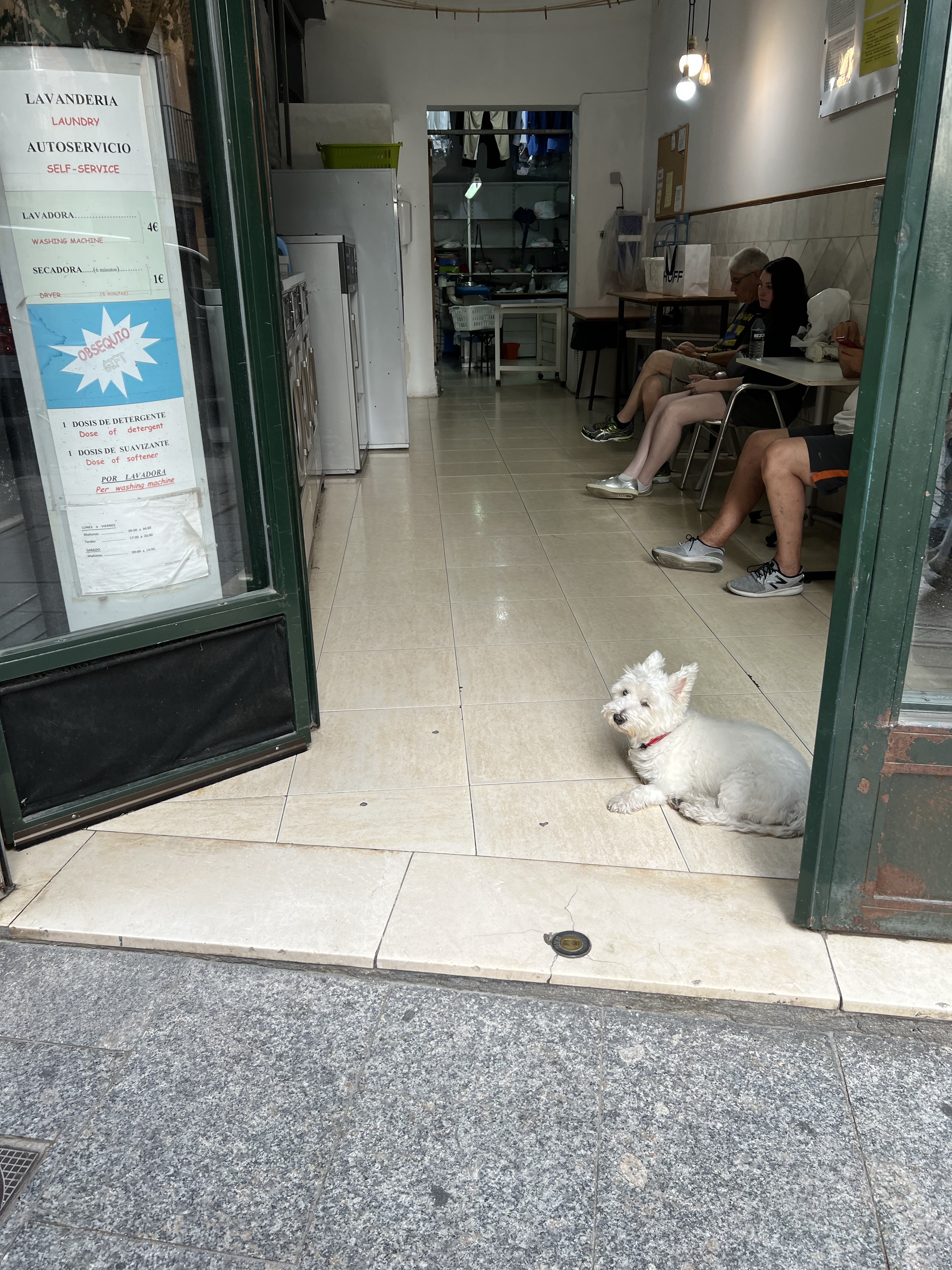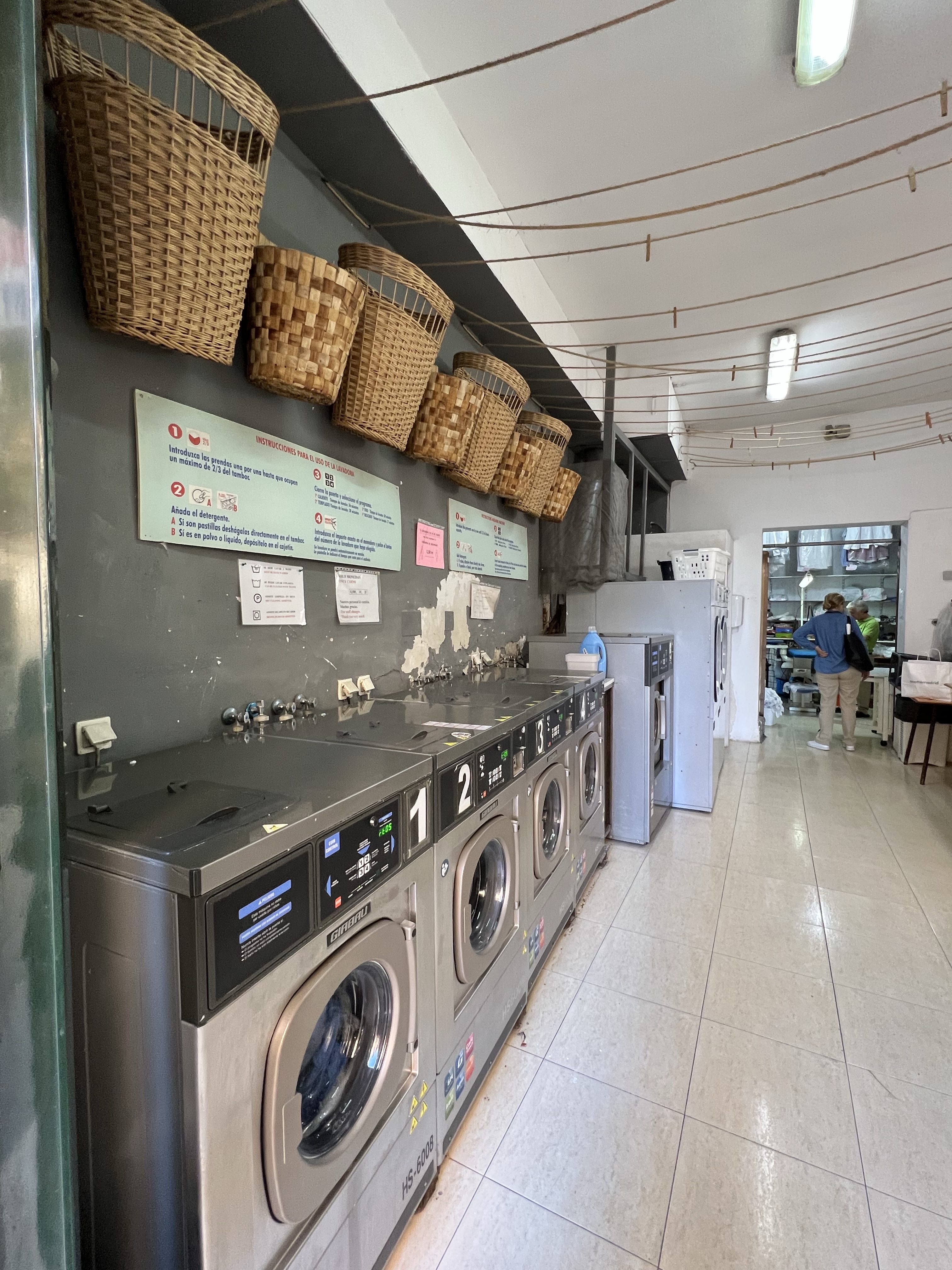 來馬德里的第一件事就是洗衣服,沿著旁邊的街道往下走轉彎就到了,除了前面自助的機台,也可以選擇給店家洗,一包洗衣袋裝的衣服9歐,包含洗烘摺其實蠻划算的,自己丟機台洗完再烘大概也要7歐,就決定兩包衣服都給他們洗,阿伯說要兩天後來拿,正好是我們離開那天,簡直完美。