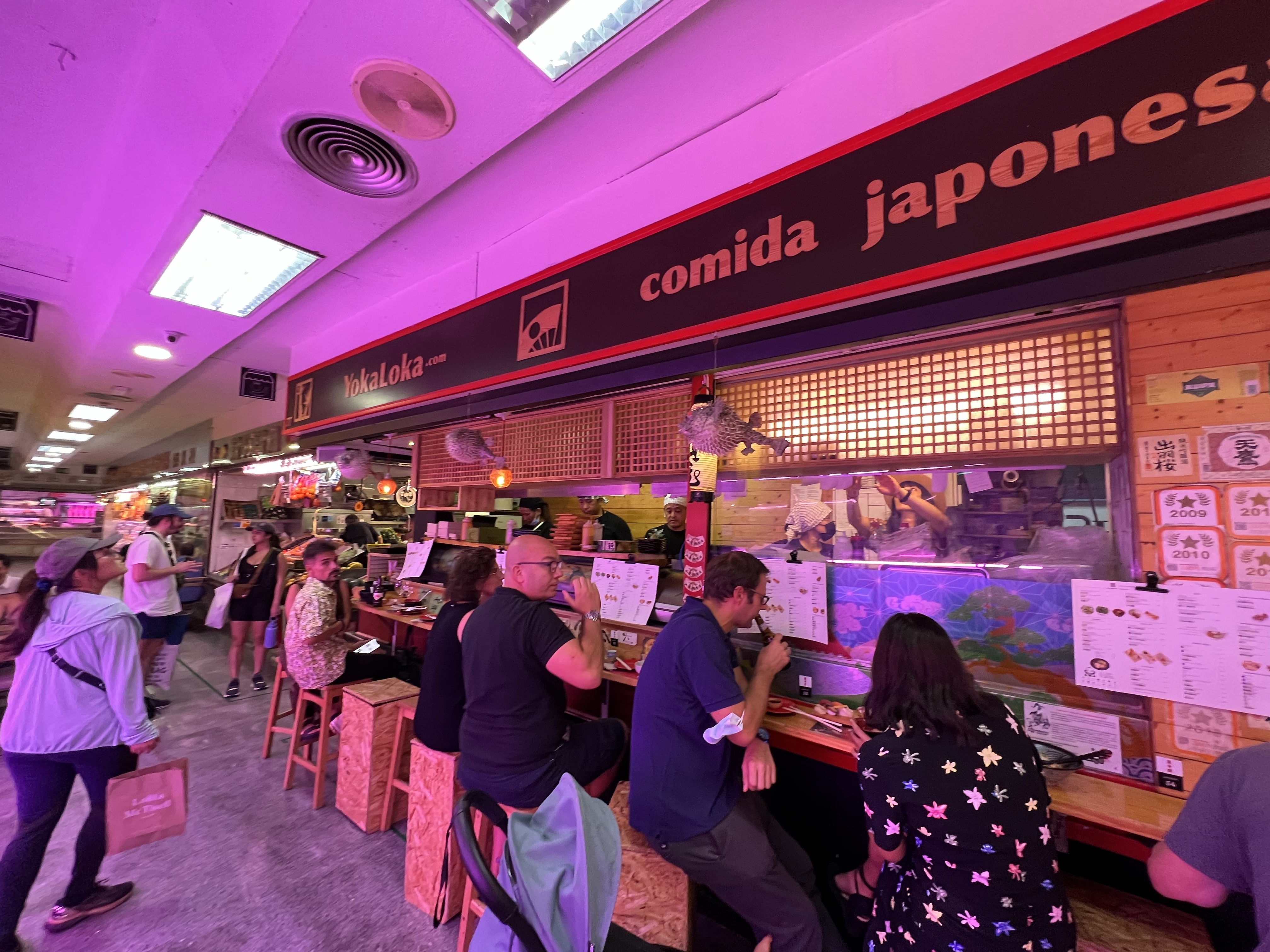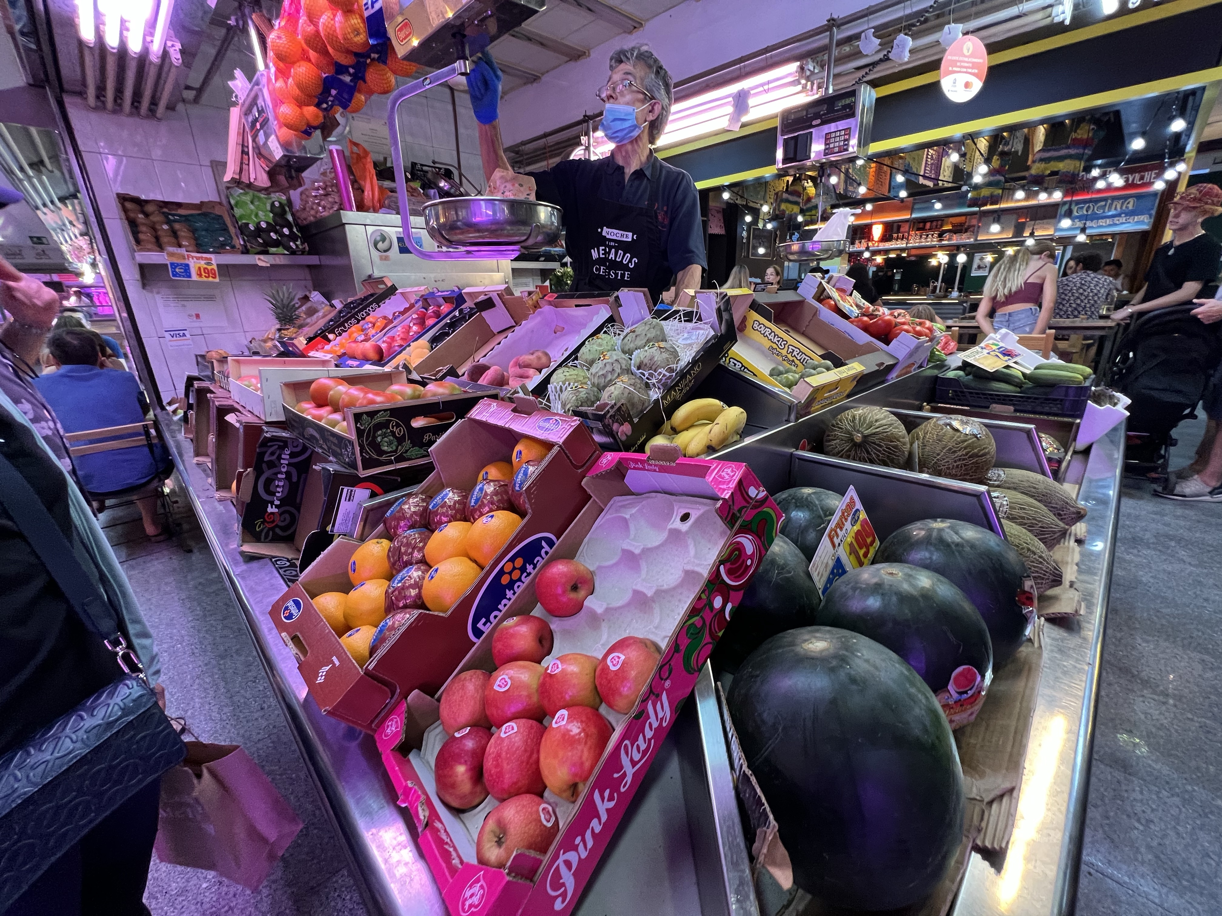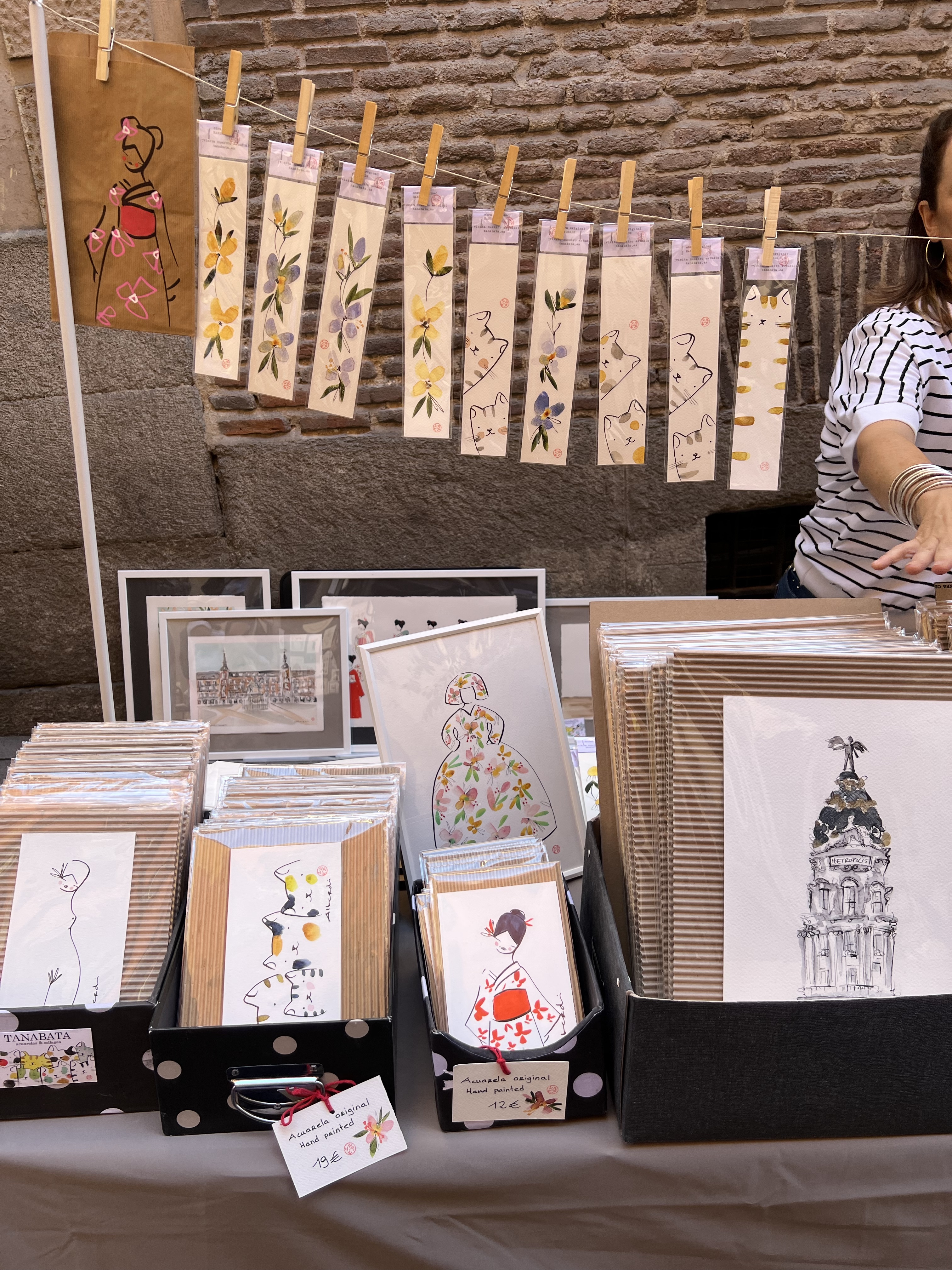 剛才走下來的街道週末有市集,多半是手作小物、繪畫、服飾等,從早擺到晚,邊逛邊走完全不無聊。走到底後再沿著旁邊的大路回頭走,走到Antón Martín市場,一進去迎面而來的就是日本居酒屋,生意極好,沒訂位吃不到;市場分兩樓,有賣新鮮海鮮、火腿、蔬果的店,也有很多間餐廳,但我們不太餓,在蔬果攤買了桃子就走了。