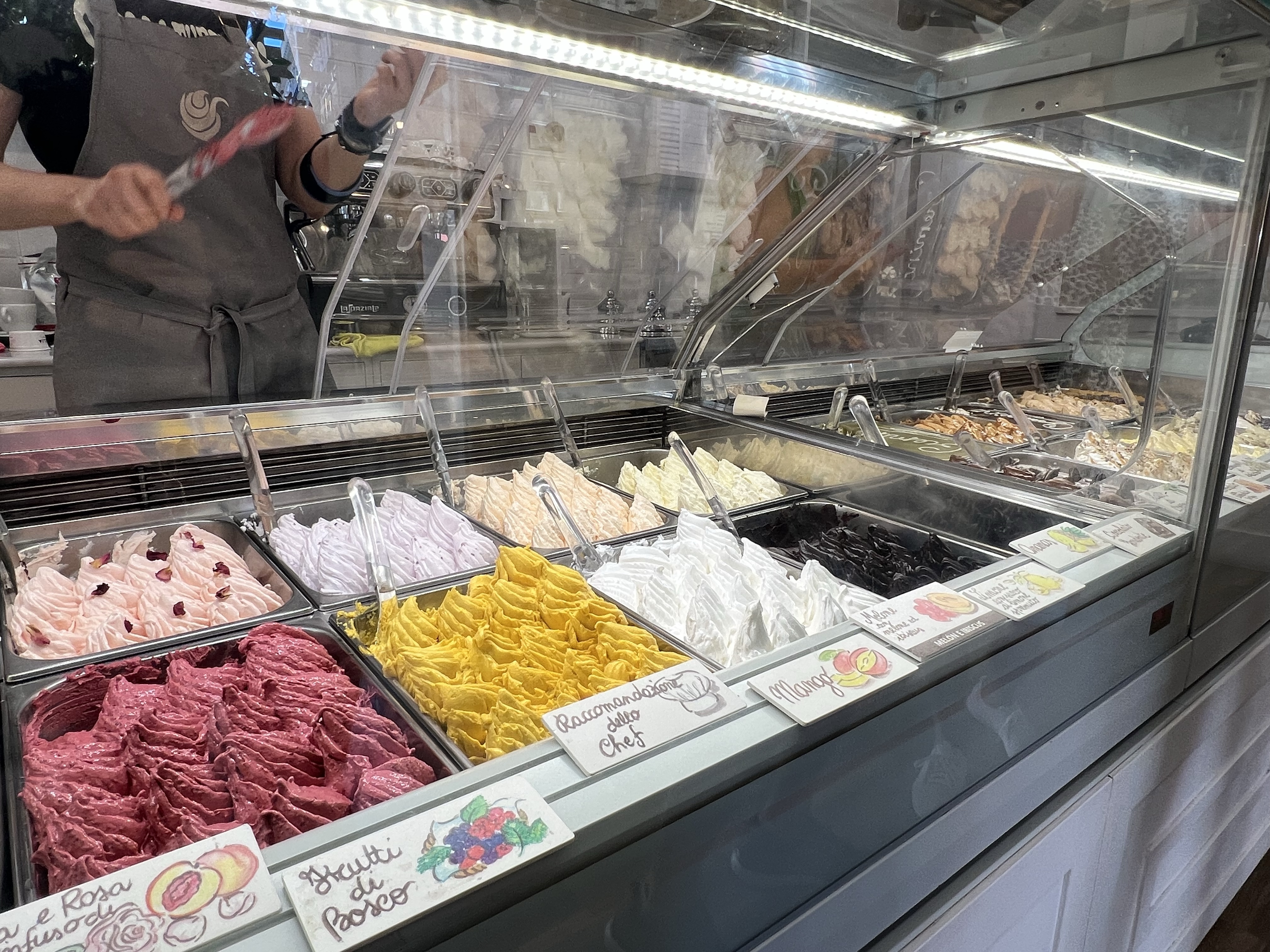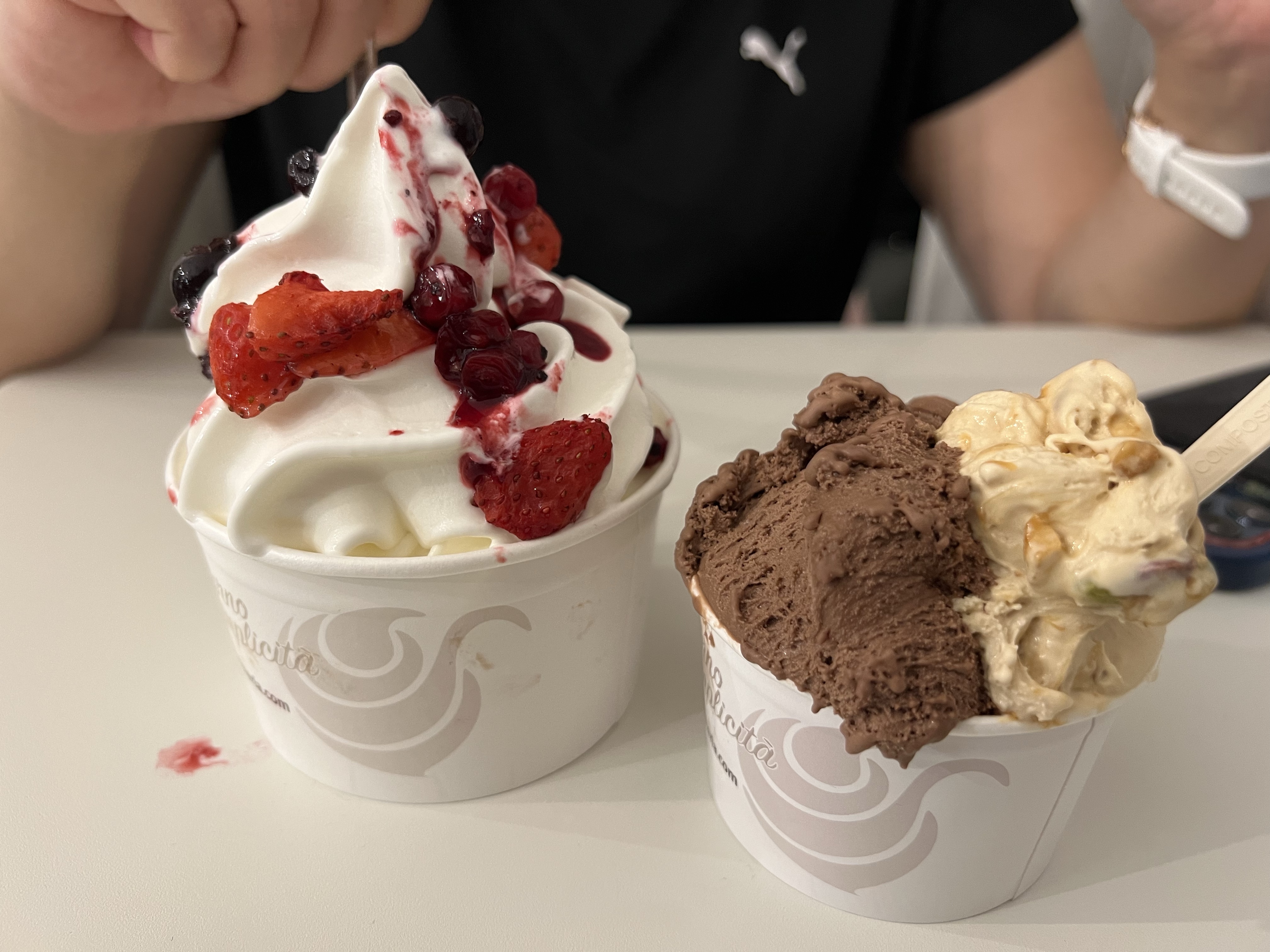 跑完已經完全天黑了,樹下的草皮還是很多人,大家好像喜歡在黑嘛嘛的環境下聊天,很是特別。三台警察車也在這時候進駐公園,不知道是不是緝毒熱點。慢慢沿著白天走過的大道回飯店,買了一塊蛋糕當飢餓時的小點;茹茹買了一罐上面寫著aqua但包裝很像椰子水的飲料,打開來果然就只是白開水,感到悲痛。走到下午吃過的冰淇淋店,營業時間居然到半夜十二點,看來是配合西班牙人吃完晚餐的時間。來都來了,就走進去點個兩球冰淇淋和一杯frozen yogurt,沒想到這frozen yogurt做得恰到好處,同時有冰淇淋的綿密又有優格的爽口,也不會有碎冰感,真的是極品!吃完發現下個路口就是我們的飯店,一直嚷嚷著要每天都來吃上一杯!