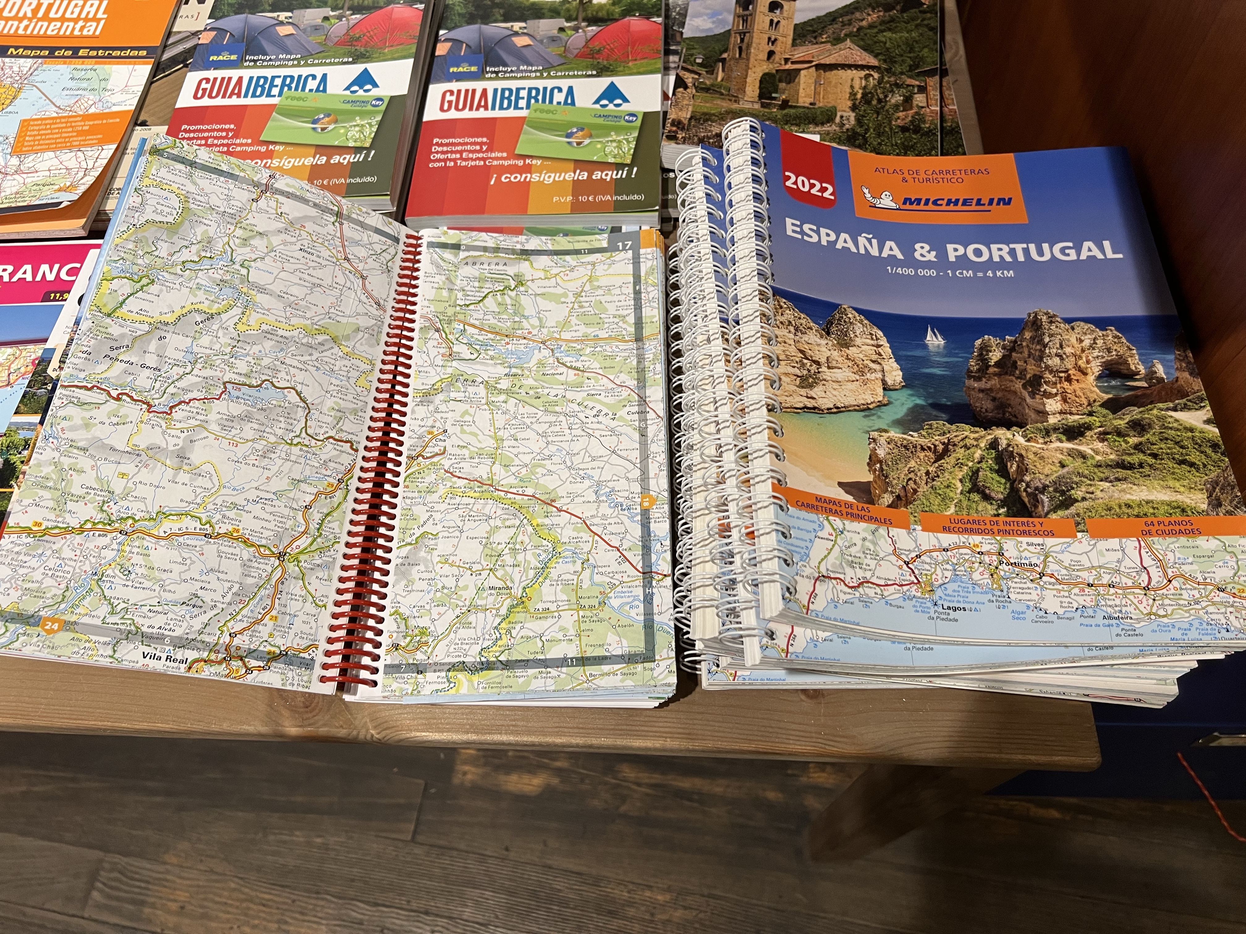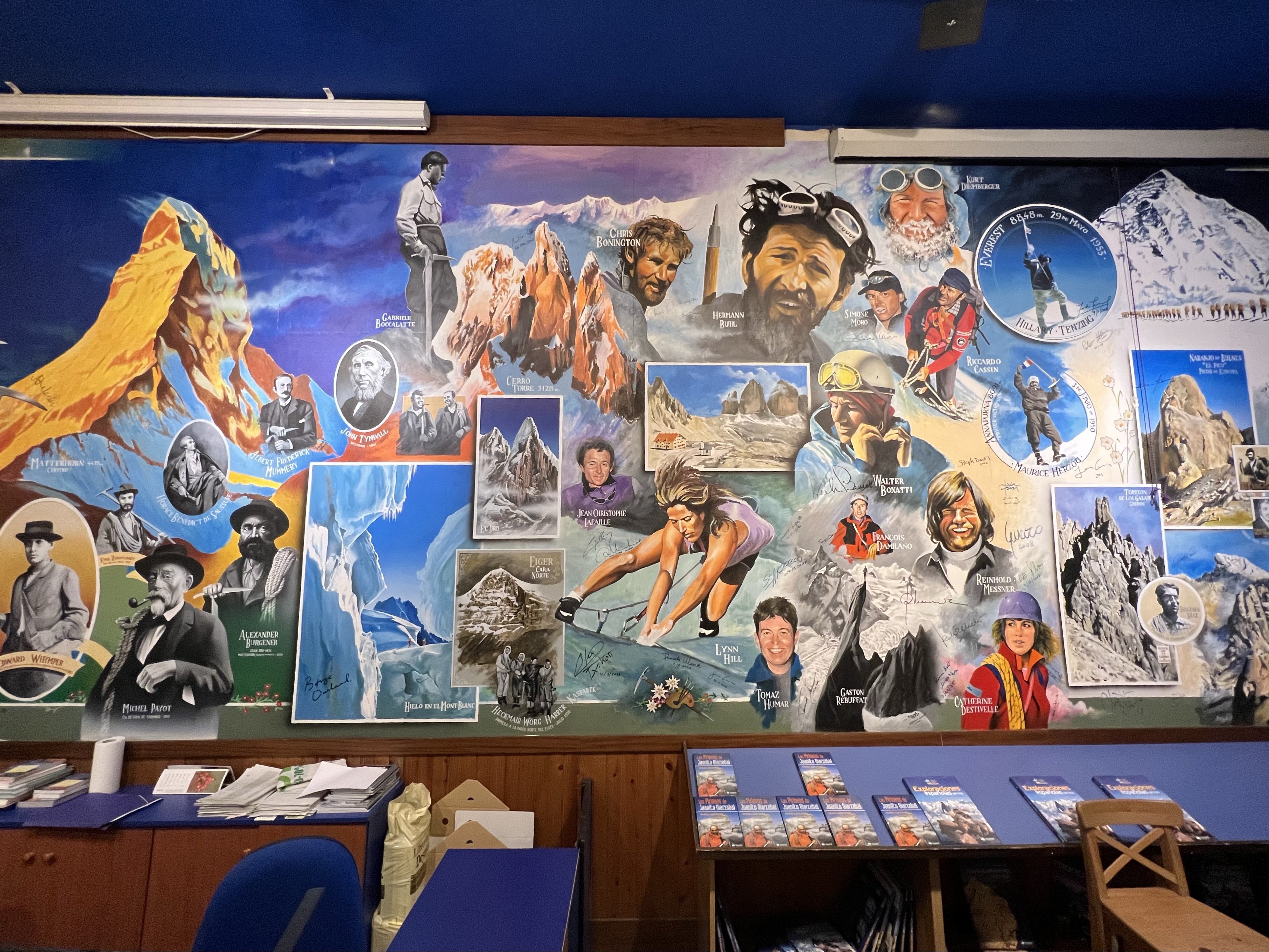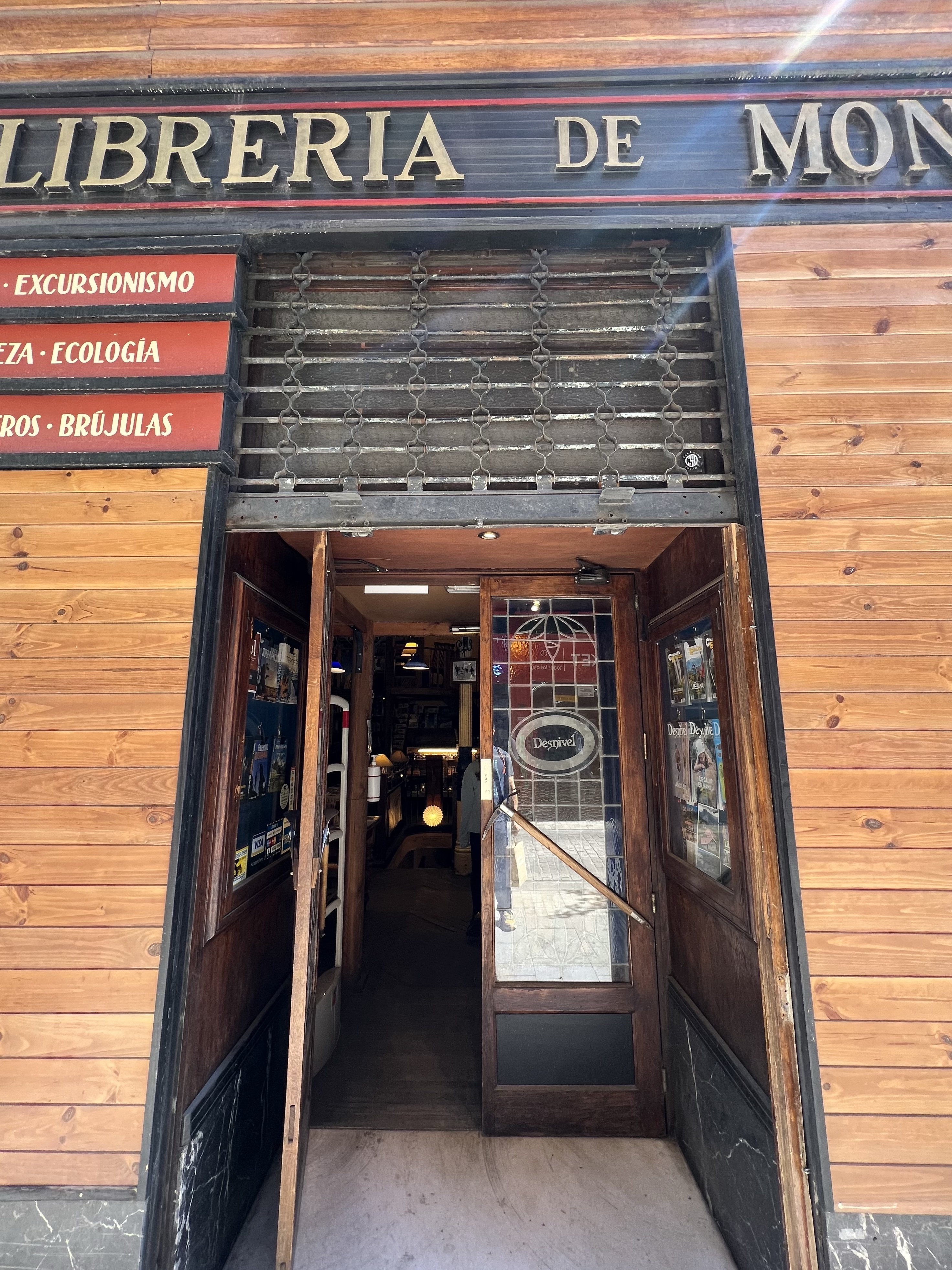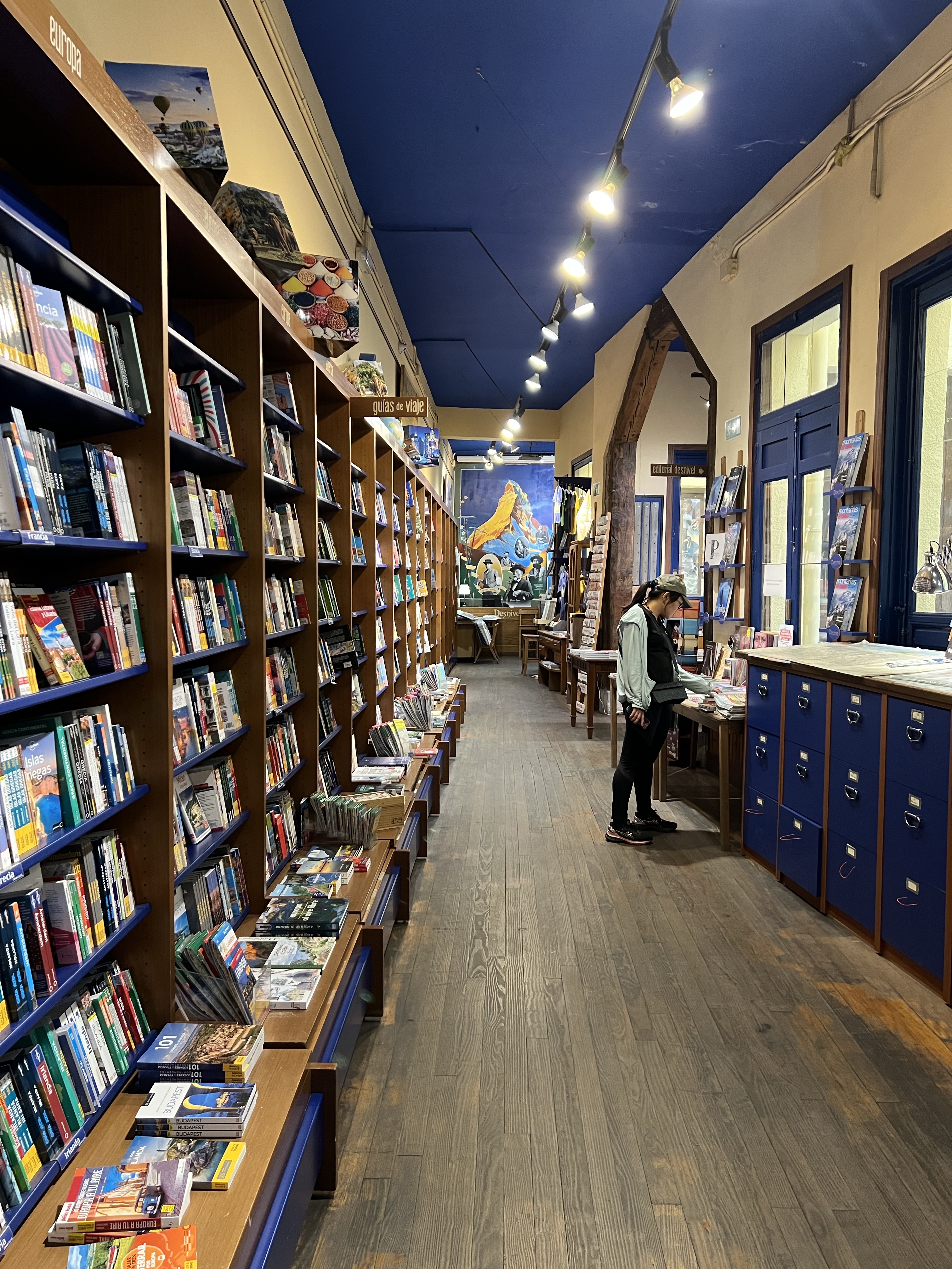 繼續往上走看見一間冰淇淋店Gioelia,點了三球冰淇淋和一個卡士達捲心酥休息一下,捲心酥普普通通,但冰淇淋很好吃。之後走進旁邊的巷子,逛了一間登山攀岩主題的書店,後面有一面牆畫了世界幾座高峰和幾位登山名家的畫像,旁邊還有幾個簽名;有一區特別教導各種攀岩技巧,牆上還有岩釘和安全繩;店內還兼賣登山露營用品,還有一區放了各式地圖,有一本米其林出版的西葡美食地圖,每一區都鉅細彌遺,根本就是伊比利半島公路地圖集附加美食指南,每個喜好公路旅行的人都該放一本在車上。