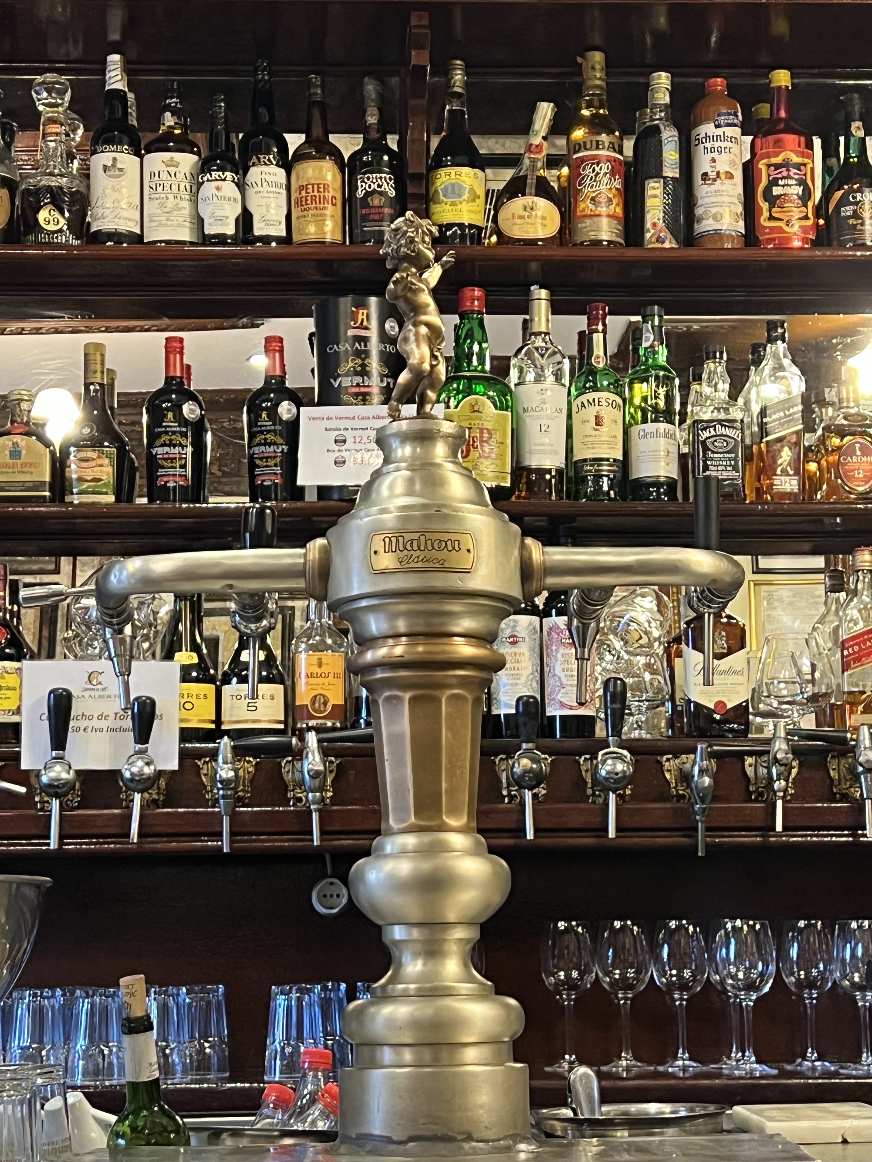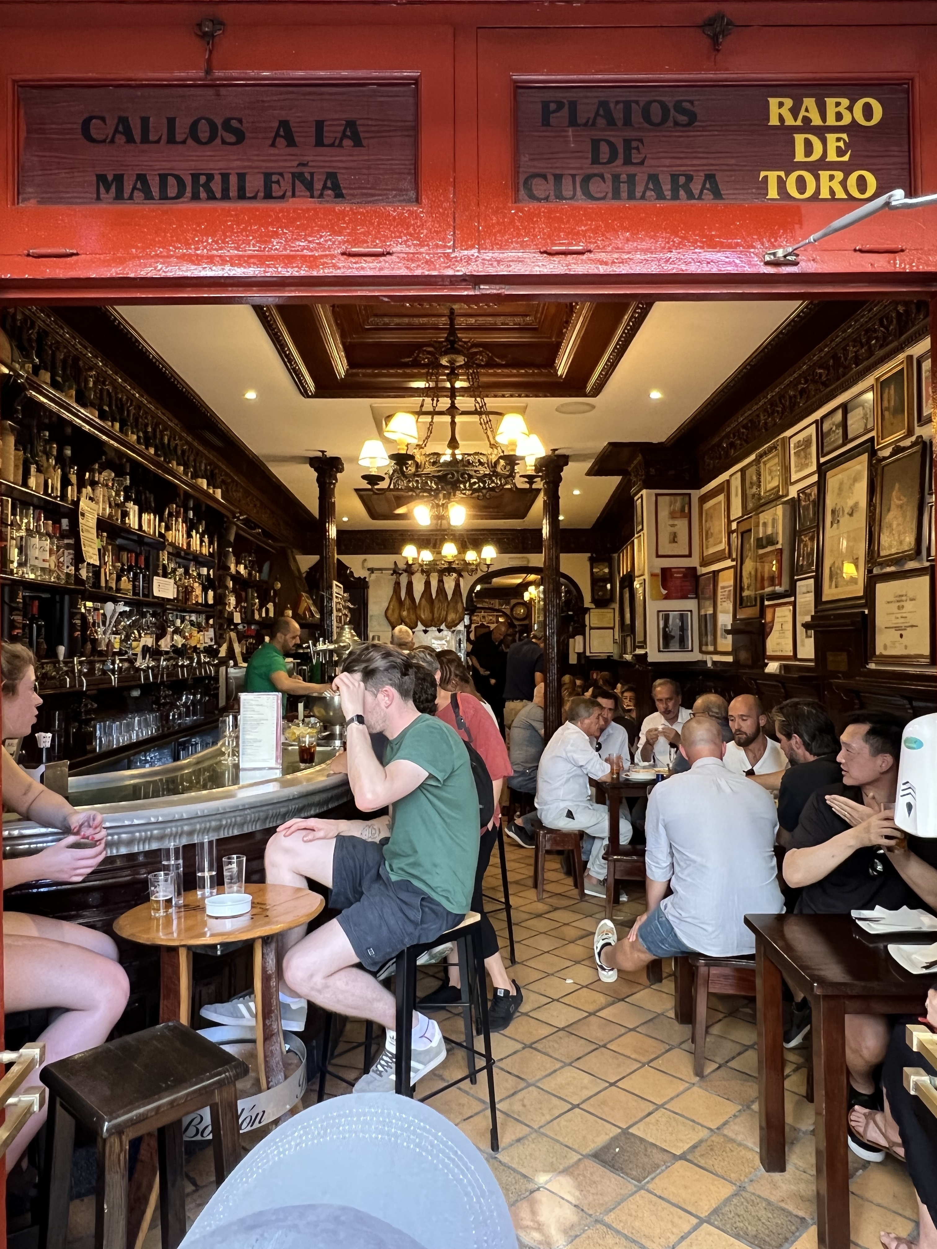 離開皇宮約莫七點,今天的行程真是史上最滿,一點也不符合我們懶散的風格,趕緊去吃個飯壓壓驚。隨意在皇宮附近找了間酒吧餐廳吃,牆上掛了一顆又一顆的牛頭,聽說是每次鬥牛後開放競標來的,感覺店主熱衷此道也財力雄厚。我們選了好幾樣的tapas,有小魚拌生鮪魚配茭白筍、烤章魚腳、馬鈴薯燉豬肉、麵包配鯷魚和酪梨、豬頰肉等等,但我只記得前菜送的炸花枝有夠好吃,還有無酒精啤酒有夠甘甜。