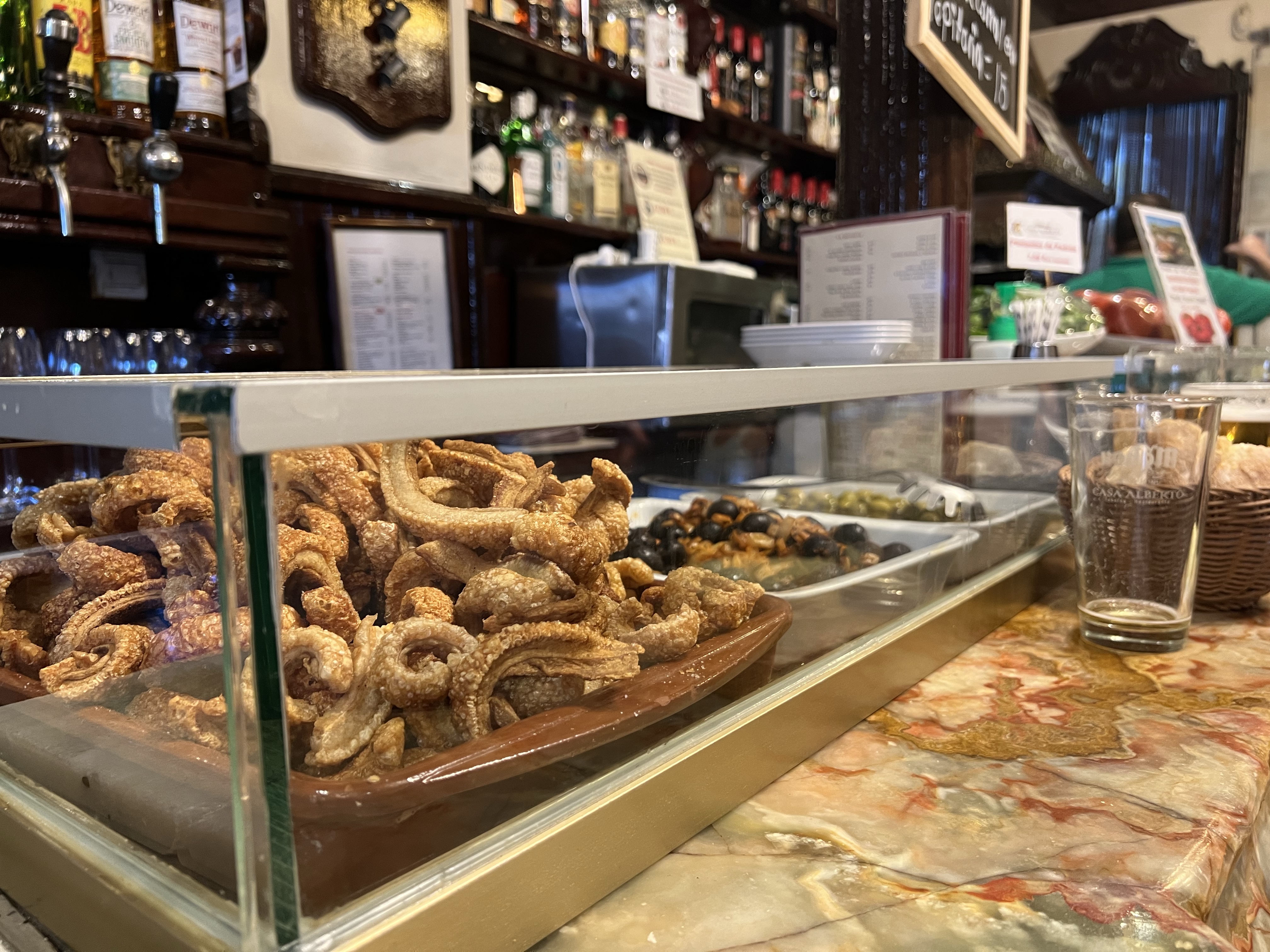 之後逛了幾家衣服店,傍晚肚子有點餓了,就選了一間人聲鼎沸的小酒館吃東西。我們點了甜椒塞肉、燉豬肉和豬皮配血腸、和炸花枝圈,店家還送了一盤炸豬皮當前菜,但我實在不喜歡,除了有點腥味外還讓我消化不良;結果最後最喜歡的還是炸花枝圈。