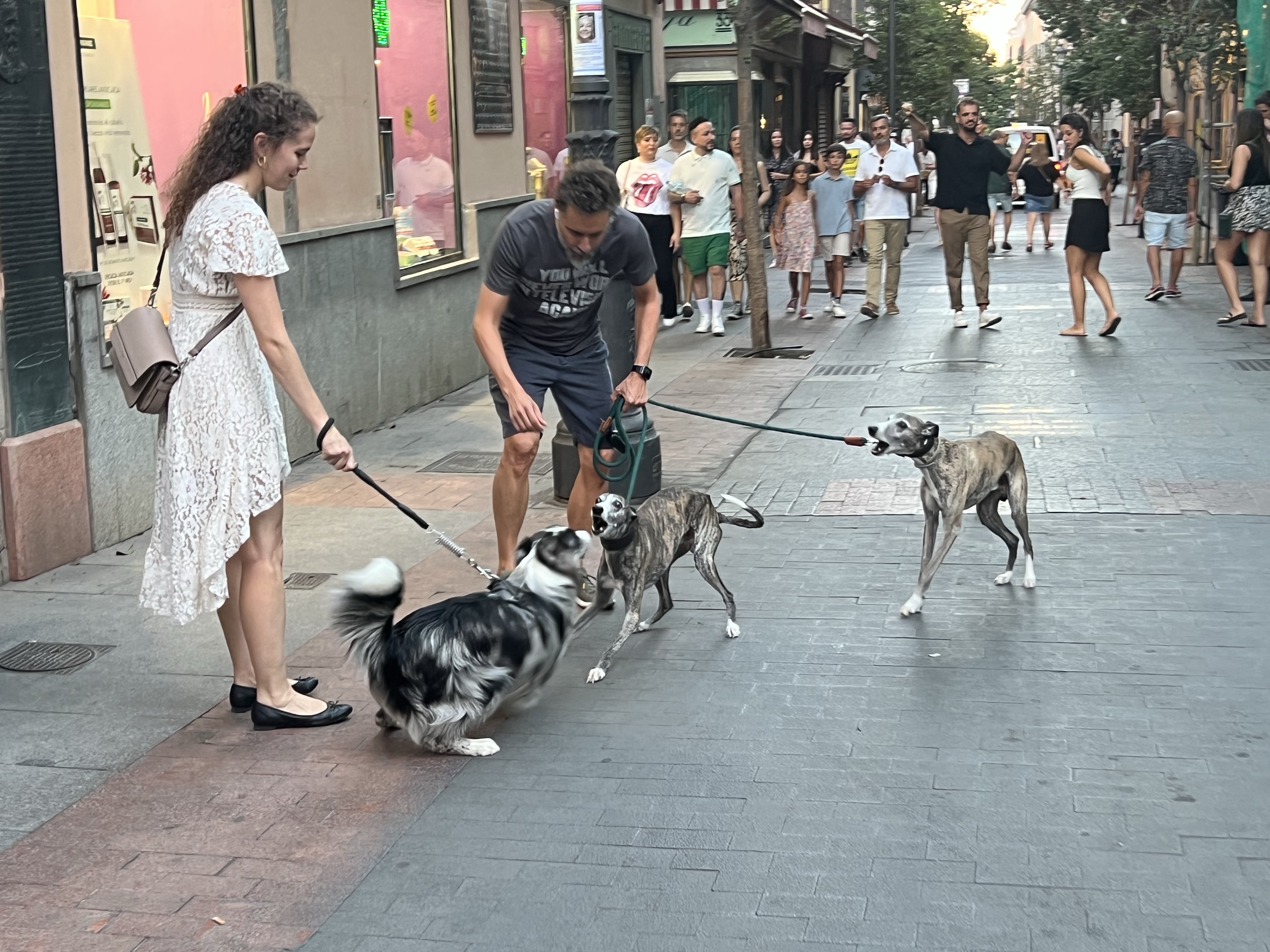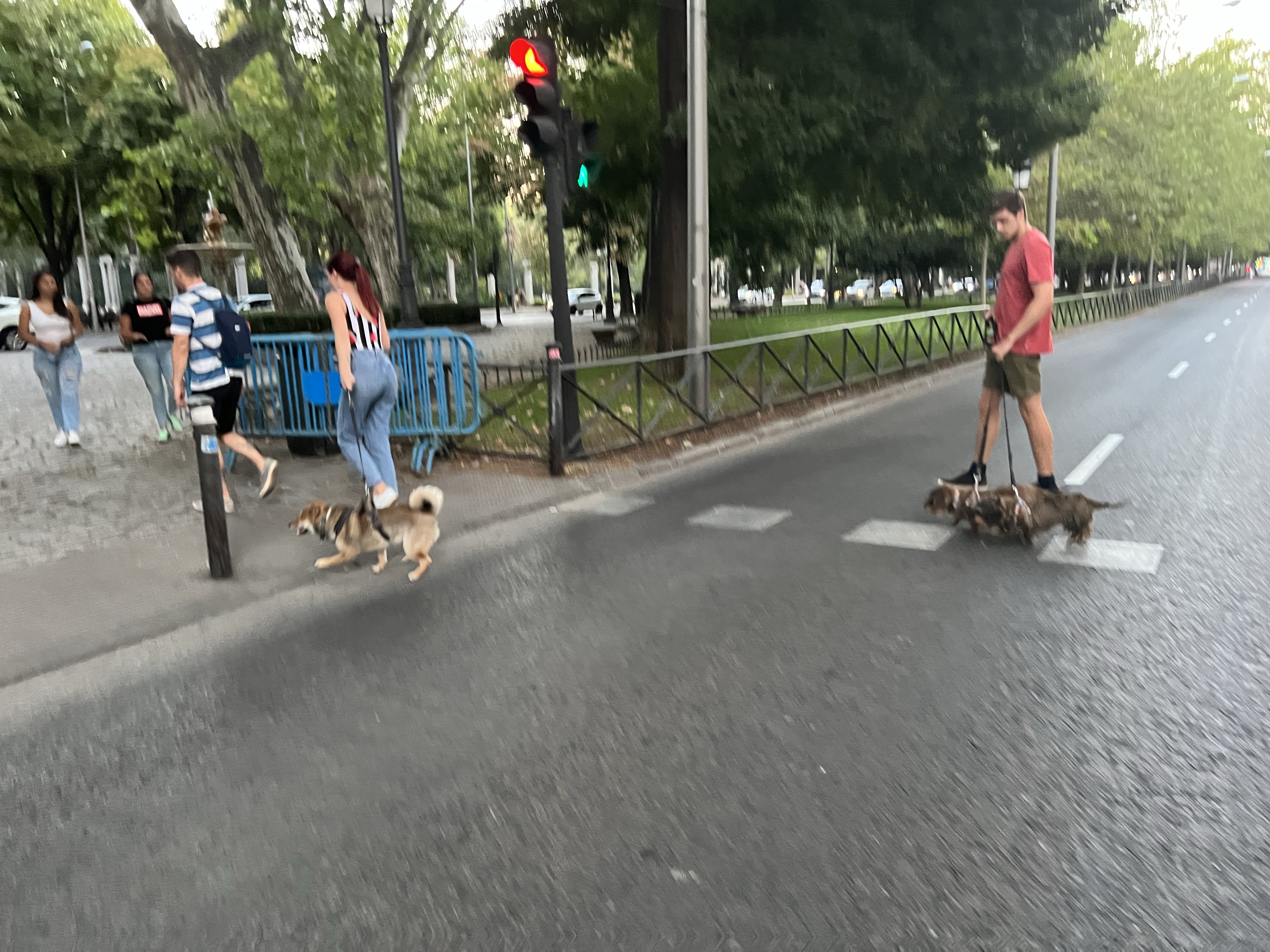 回飯店休息一下,到太陽快下山再出門。往下走到馬德里最大的麗池公園跑步,沿路看到很多人帶狗出來散步,有兩隻獵犬對上兩隻牧羊犬,互相狂吠一陣,看起來明顯是種族衝突;還有隻柴犬一路上到處挑釁別的狗,有小女孩想要摸他還被立馬嫌棄。