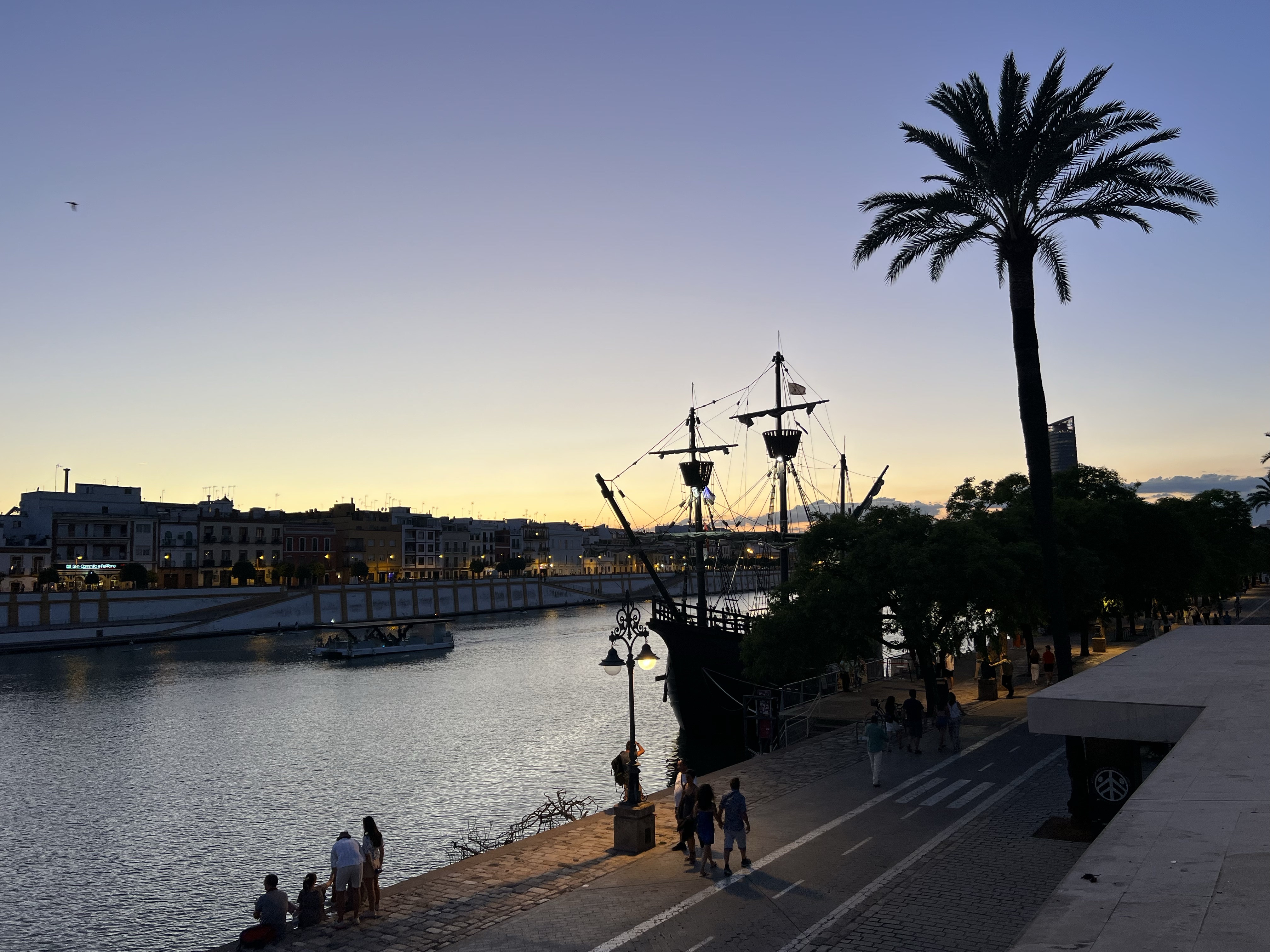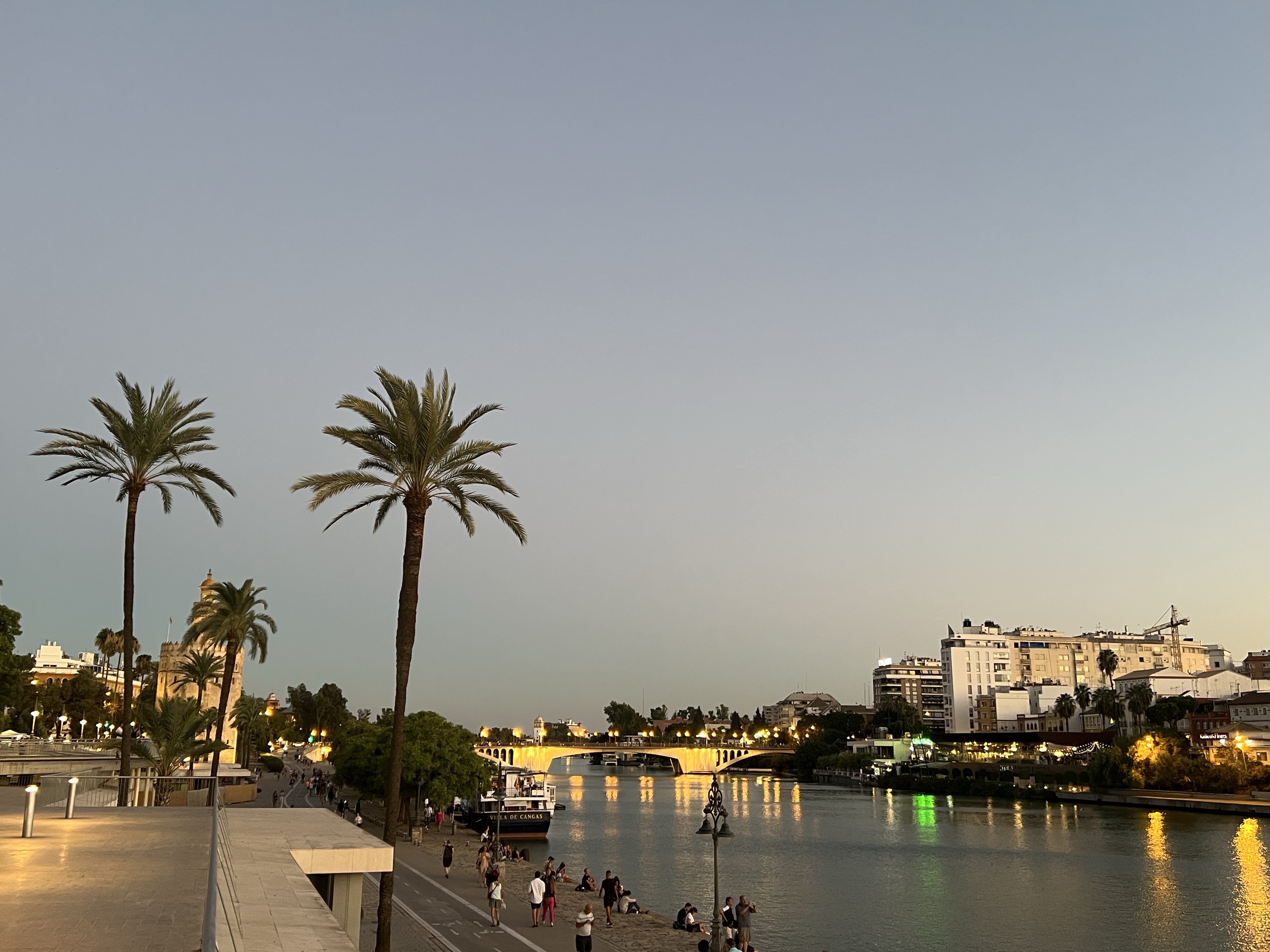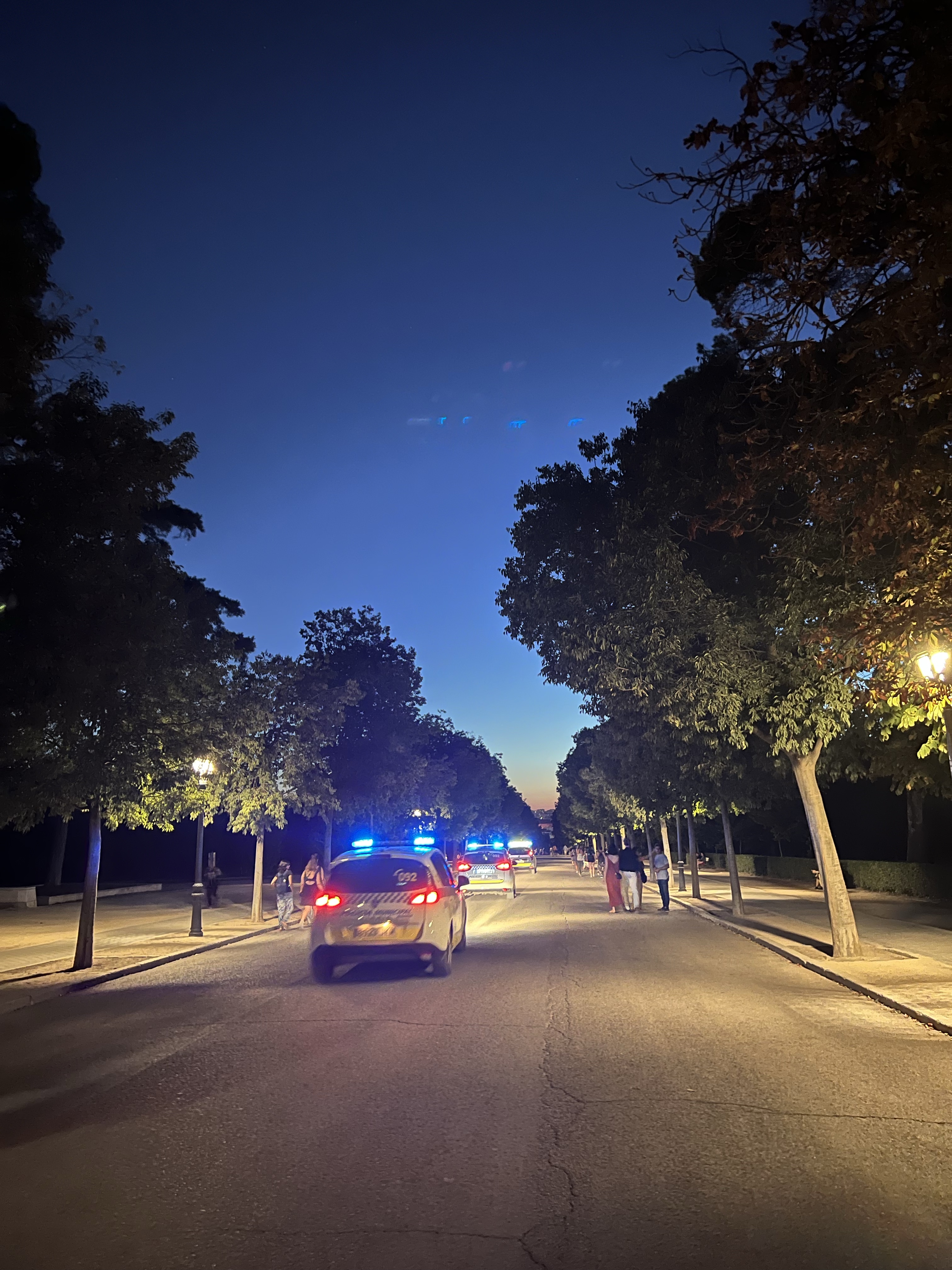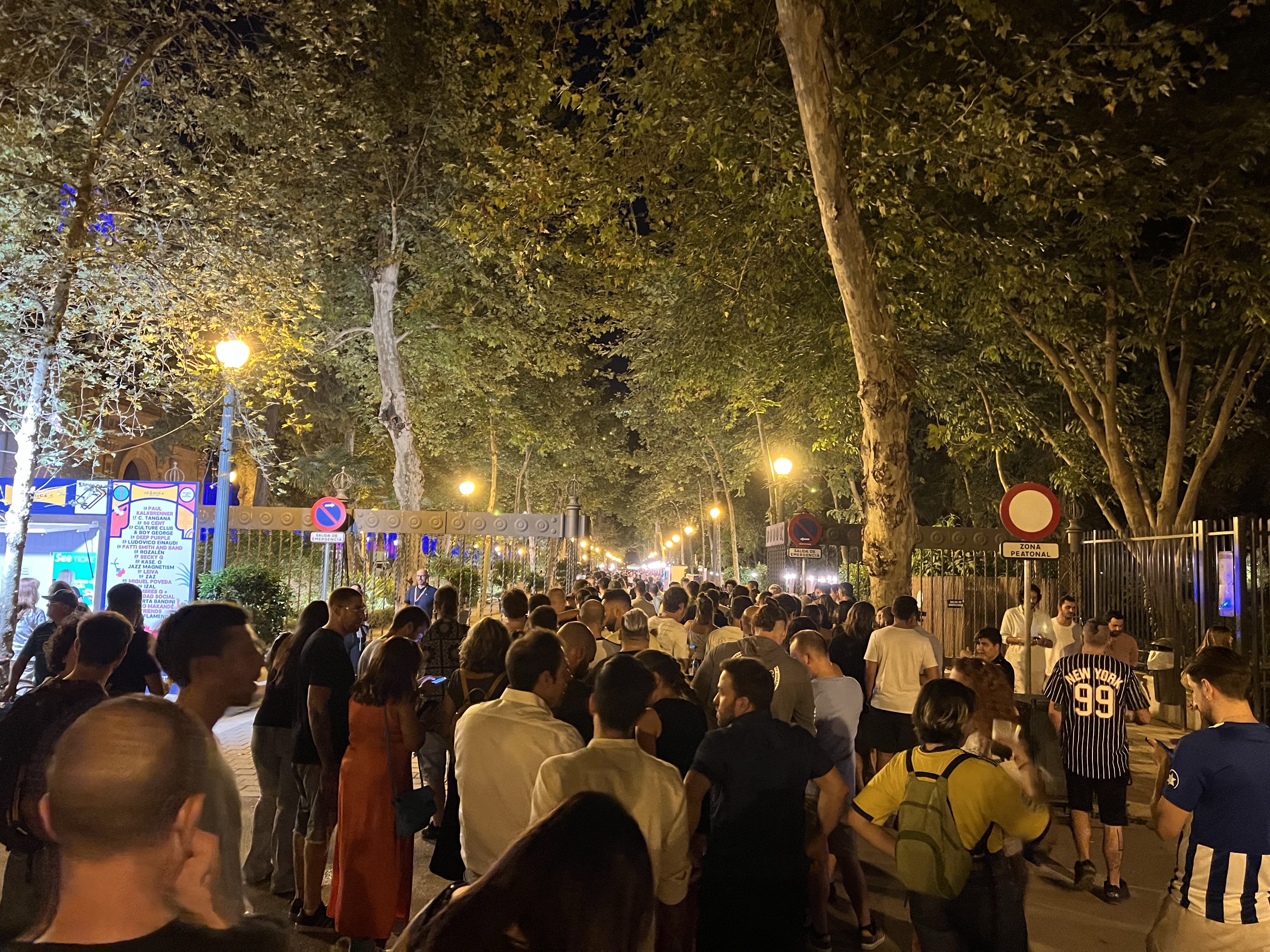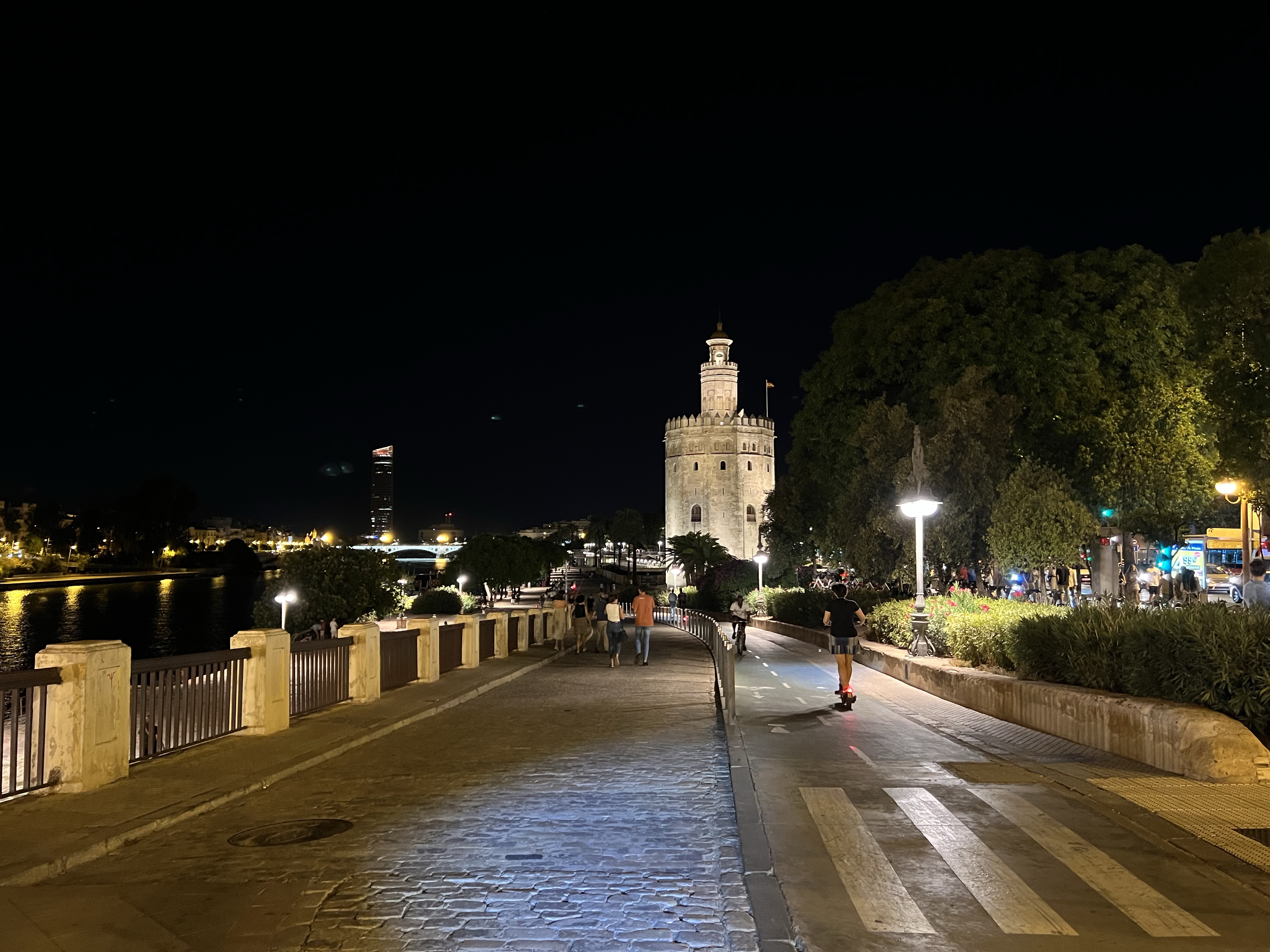 進到公園裡才發現西班牙廣場整個被圍起來,因為現在正好是某個塞維亞的大型音樂祭,今晚是要買票才能入場的大演唱會,我們只好在入口處眺望閃著藍紫色奇異光線的廣場(但其實什麼都看不到)。在公園的石凳上休息了一下,就又騎了滑板車回飯店,這次學乖了,從頭到尾都騎在馬路邊的腳踏車道上,儘管十分平順,但騎在呼嘯而過的汽車旁還是蠻緊張的。