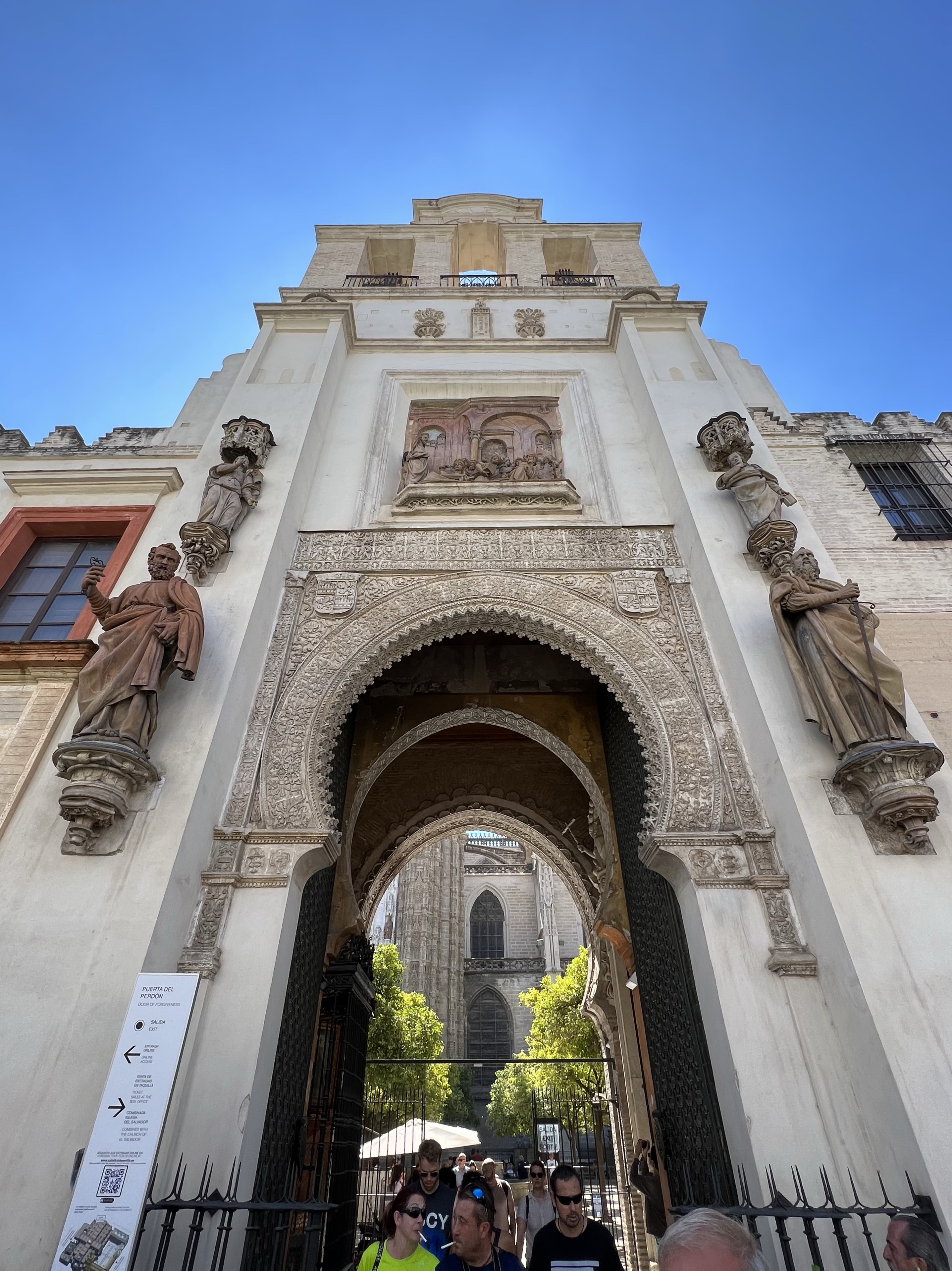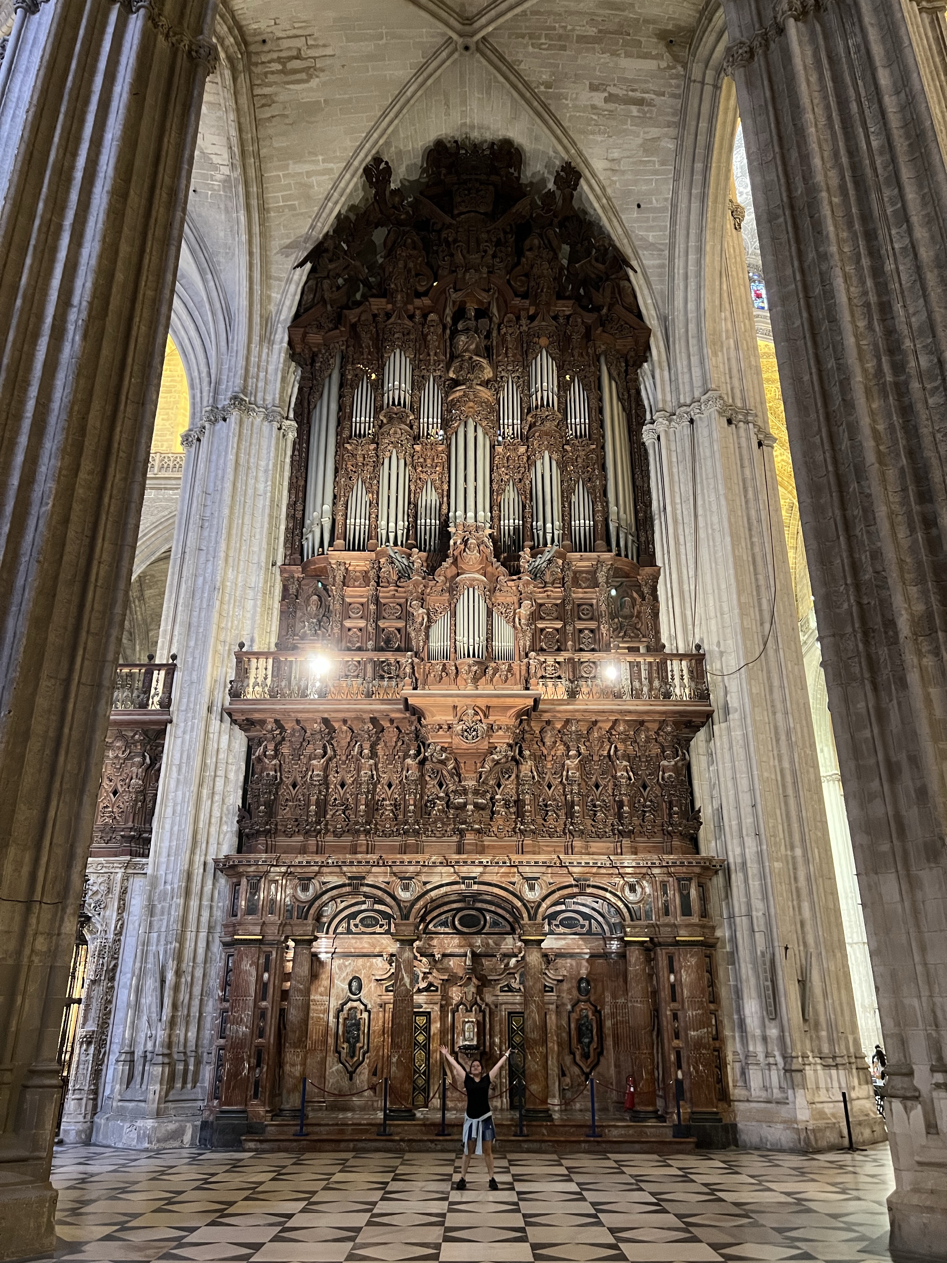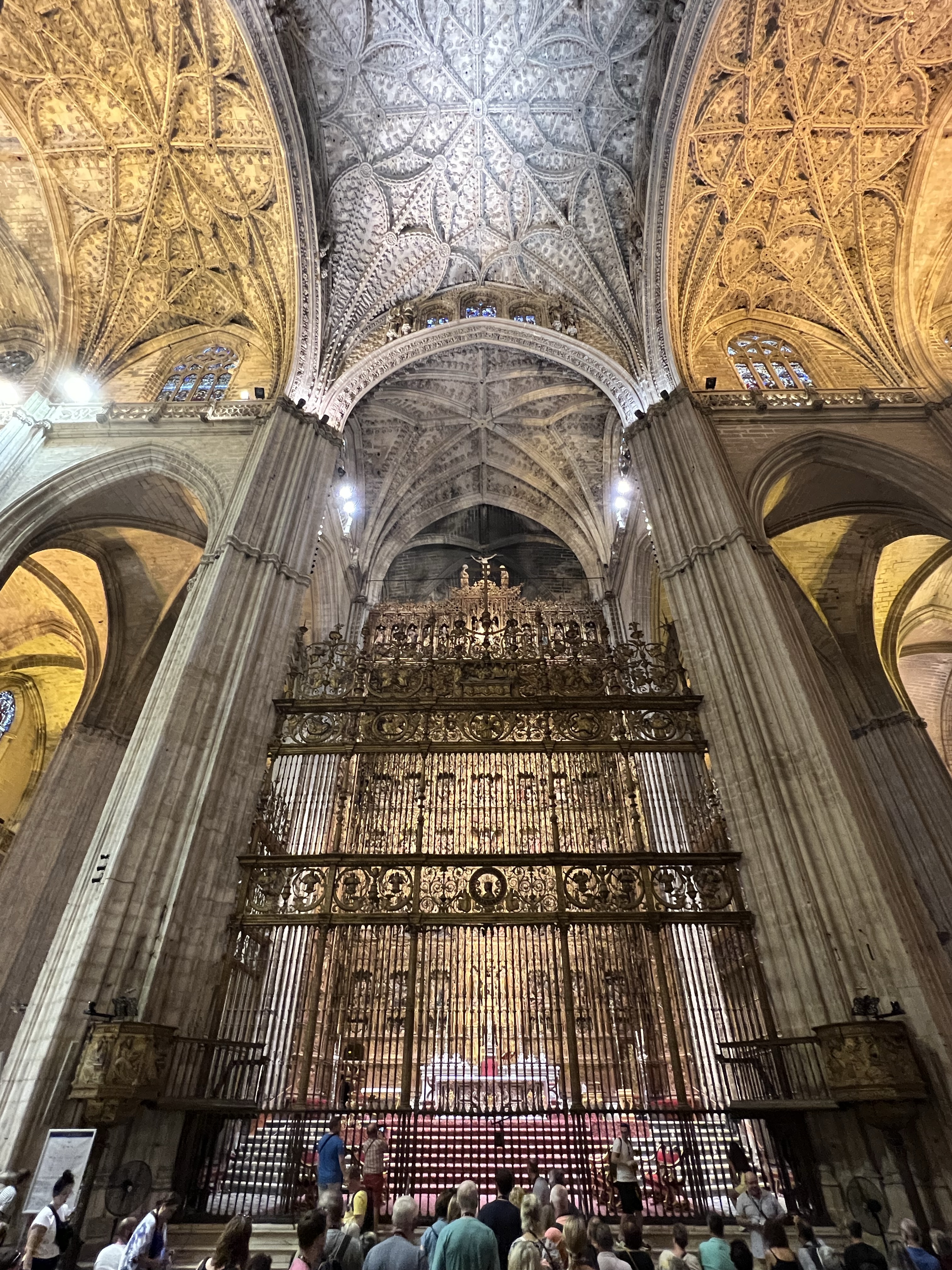 主教座堂的線上購票系統完善,掃描QR code進去購票頁面,選好最近的參觀時間,線上付款就拿到電子票券了,入場掃一下就好,買票到入場大概兩分鐘,相比於阿爾罕布拉宮的迂,我實在是感動涕零。入場後先登上鐘塔,走著一圈圈向上繞行的樓梯,通道狹小很難超車,前面的人如果走太慢會有點痛苦。登頂後就可以看到四面不同的風景,整座塞維亞城一覽無遺,還可以看到整座主教座堂正是一個十字架的形狀。四面觀景台都有完整的鐵窗,茹茹為了拍照把手機拿到鐵窗外拍,我嚇到滿手手汗。