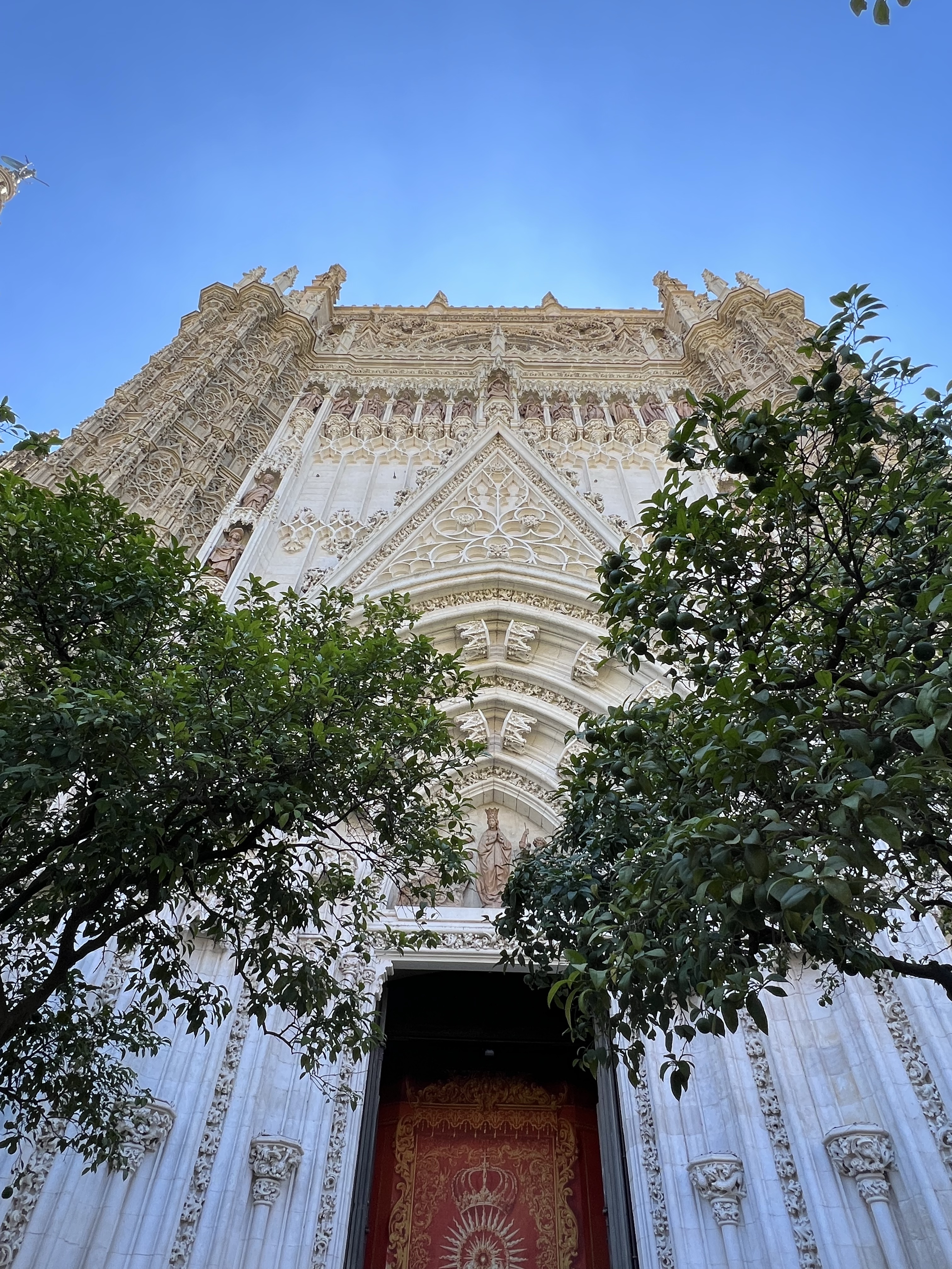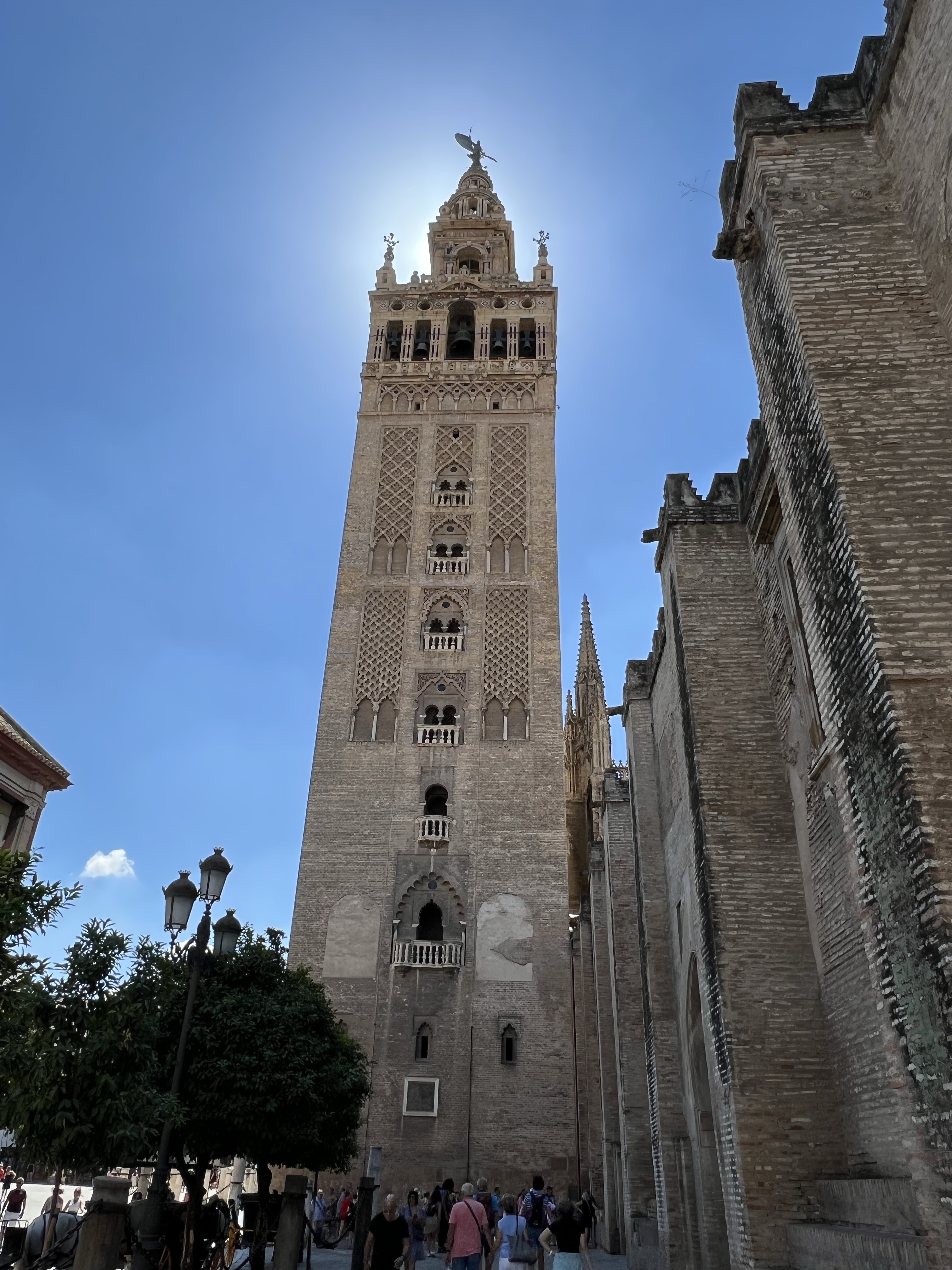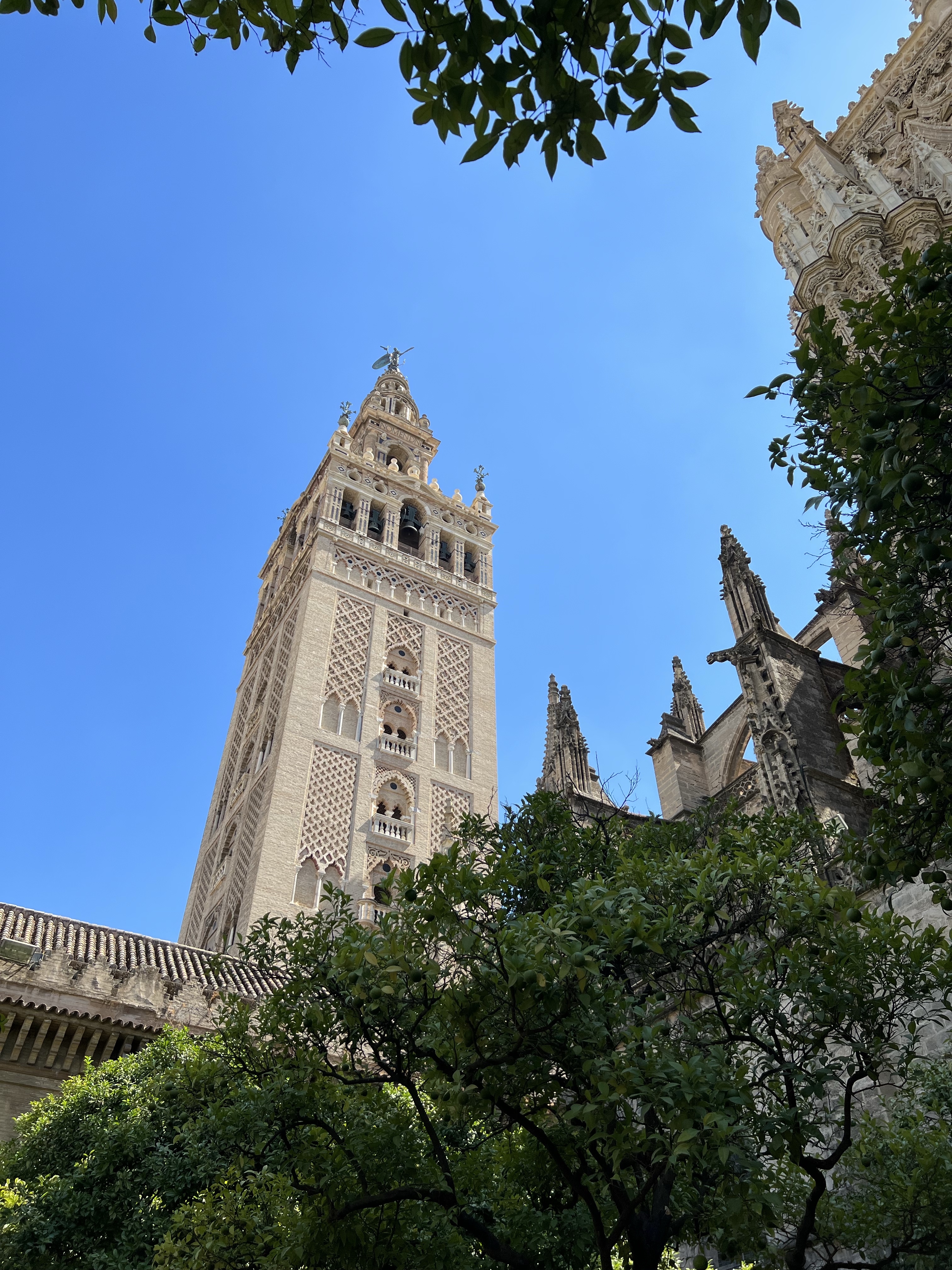 主教座堂的線上購票系統完善,掃描QR code進去購票頁面,選好最近的參觀時間,線上付款就拿到電子票券了,入場掃一下就好,買票到入場大概兩分鐘,相比於阿爾罕布拉宮的迂,我實在是感動涕零。入場後先登上鐘塔,走著一圈圈向上繞行的樓梯,通道狹小很難超車,前面的人如果走太慢會有點痛苦。登頂後就可以看到四面不同的風景,整座塞維亞城一覽無遺,還可以看到整座主教座堂正是一個十字架的形狀。四面觀景台都有完整的鐵窗,茹茹為了拍照把手機拿到鐵窗外拍,我嚇到滿手手汗。