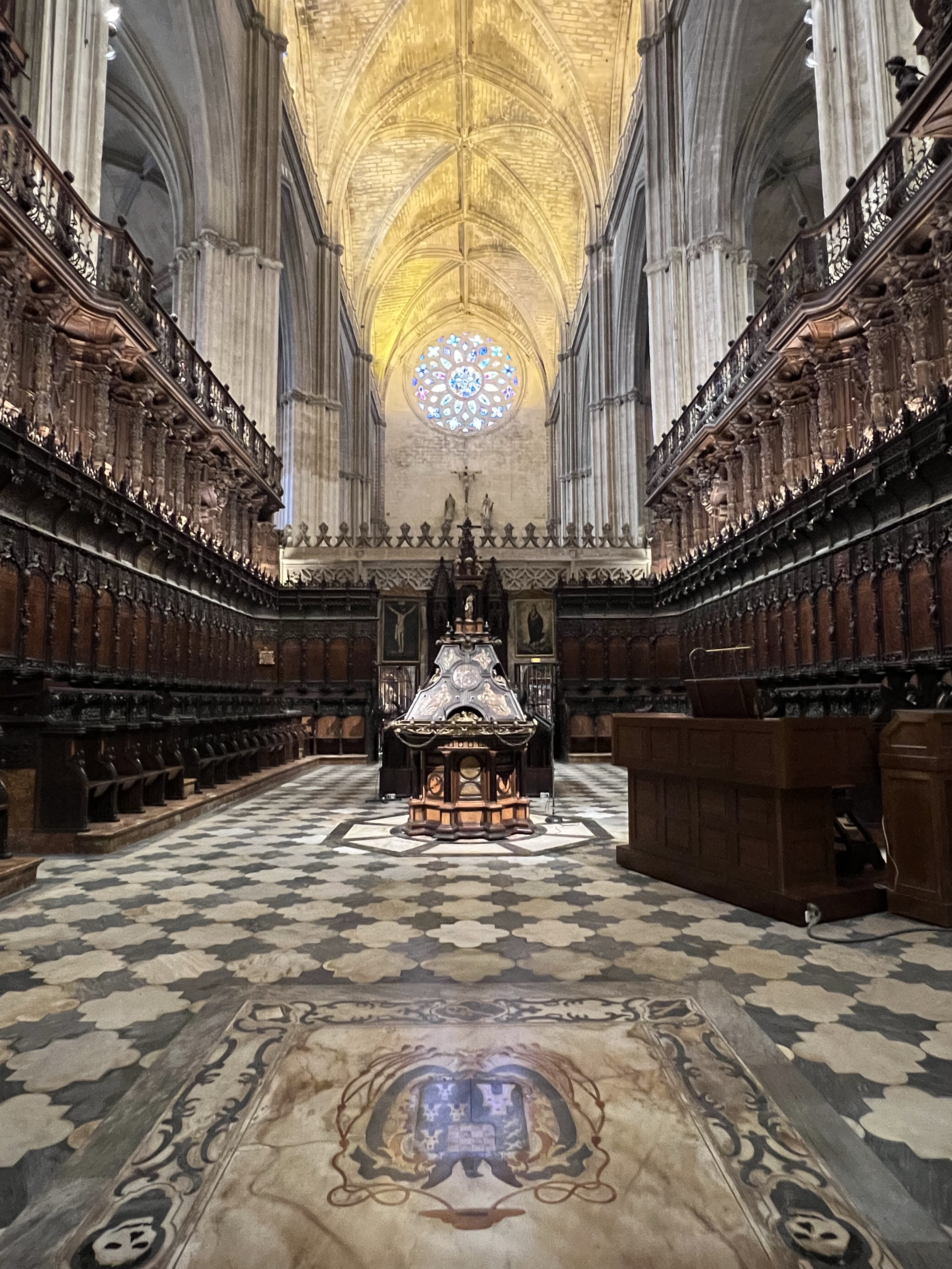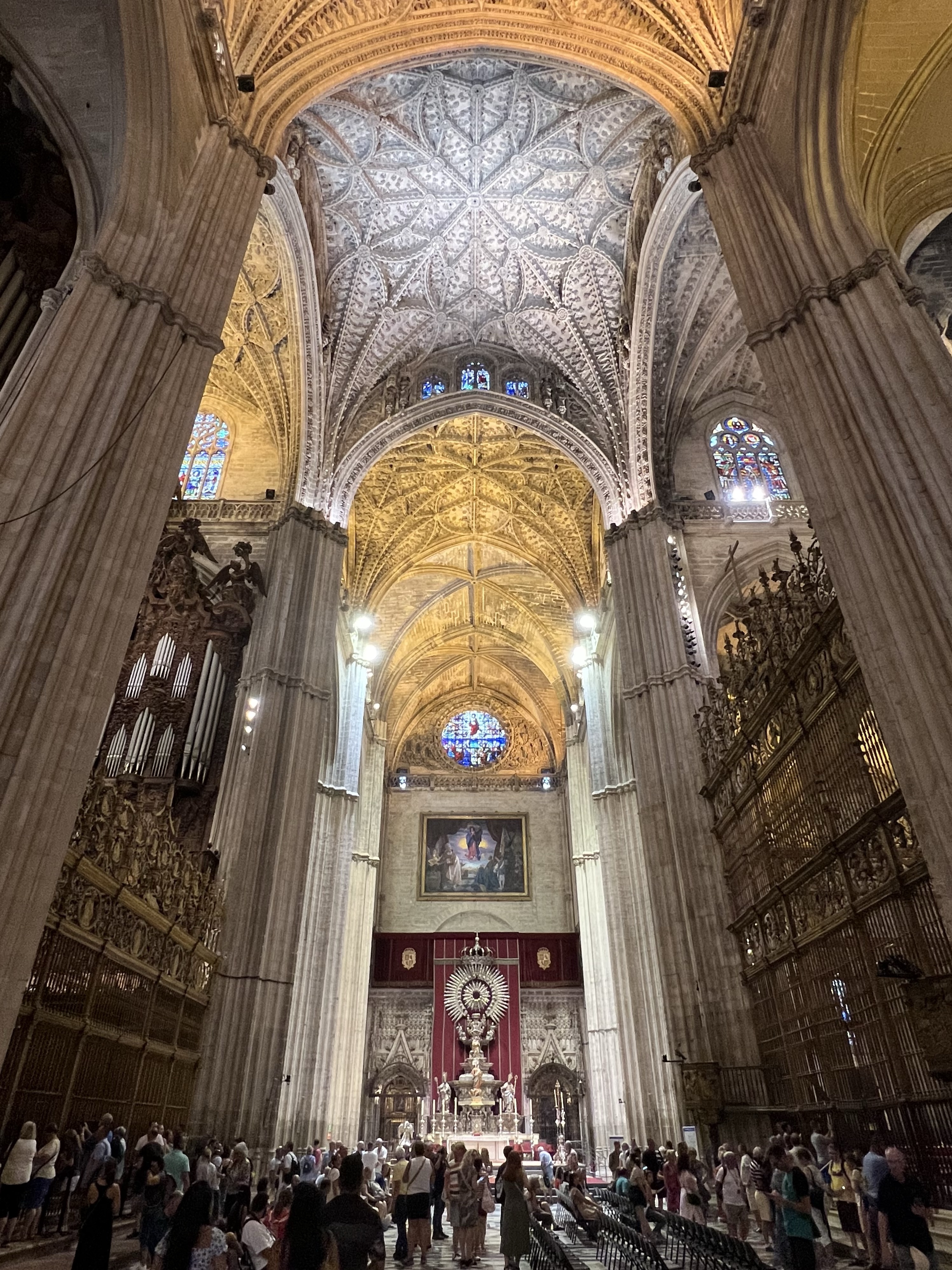 走下鐘塔進到大教堂內部,屋頂很高、管風琴很大,有好幾座很高的神龕,被超大鐵門隔起來的我想是最主要的,旁邊每一個方型空間都有個別的神龕,宗教知識淺薄如我完全無法辨識其中的不同,只知道其中一座是哥倫布下葬的地方。