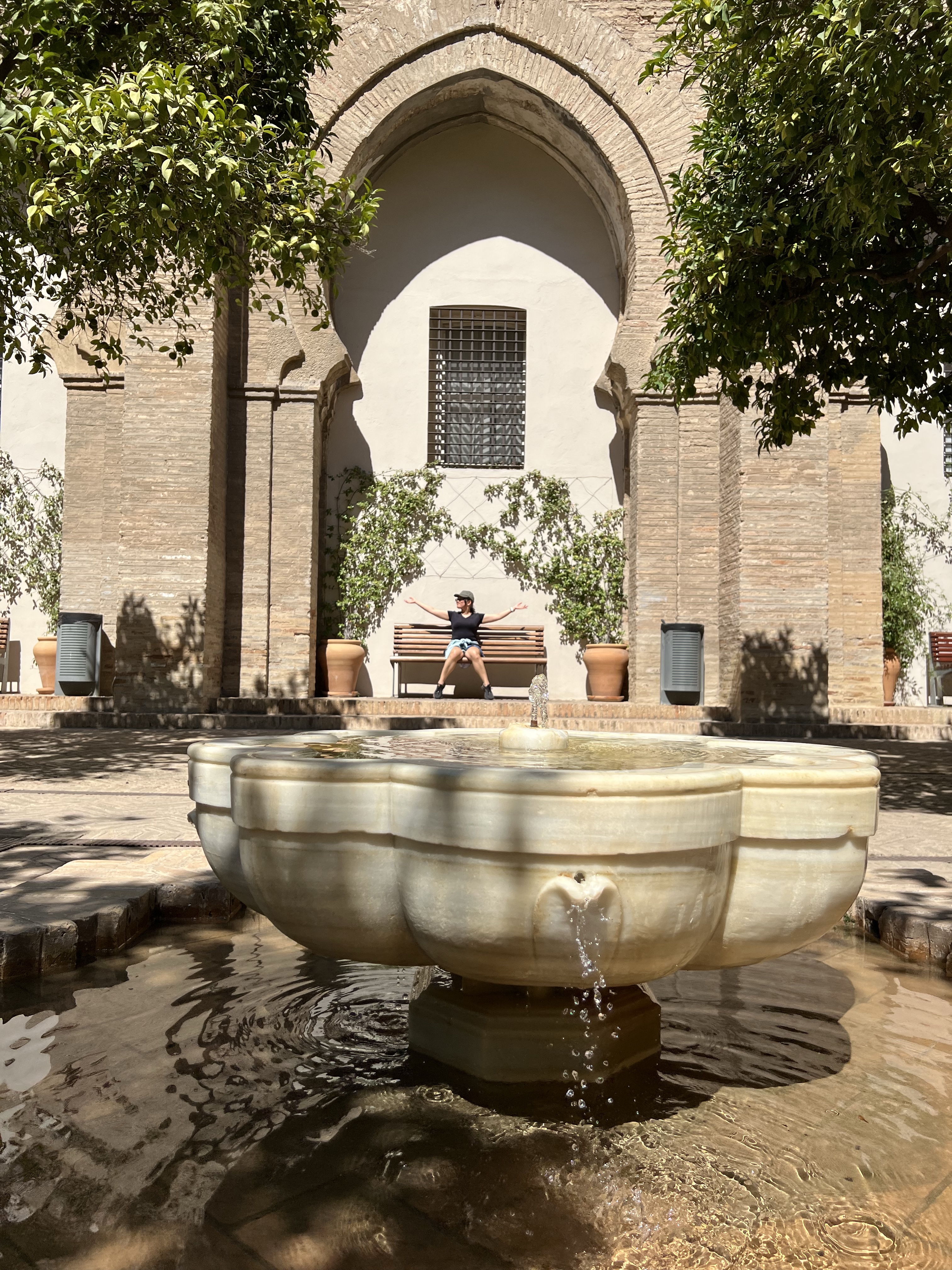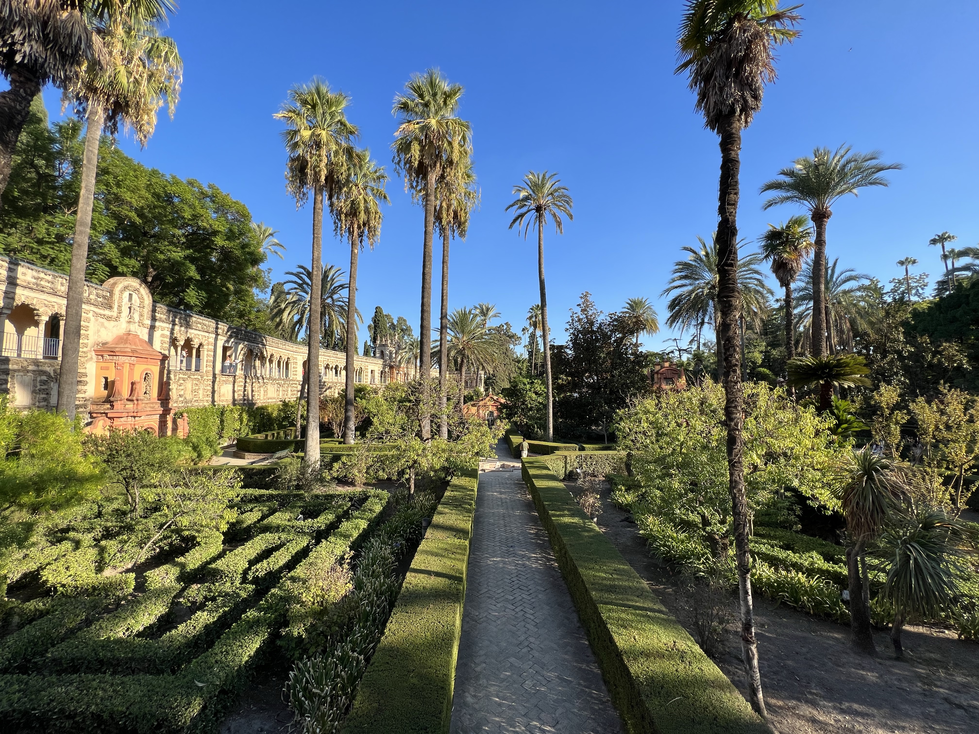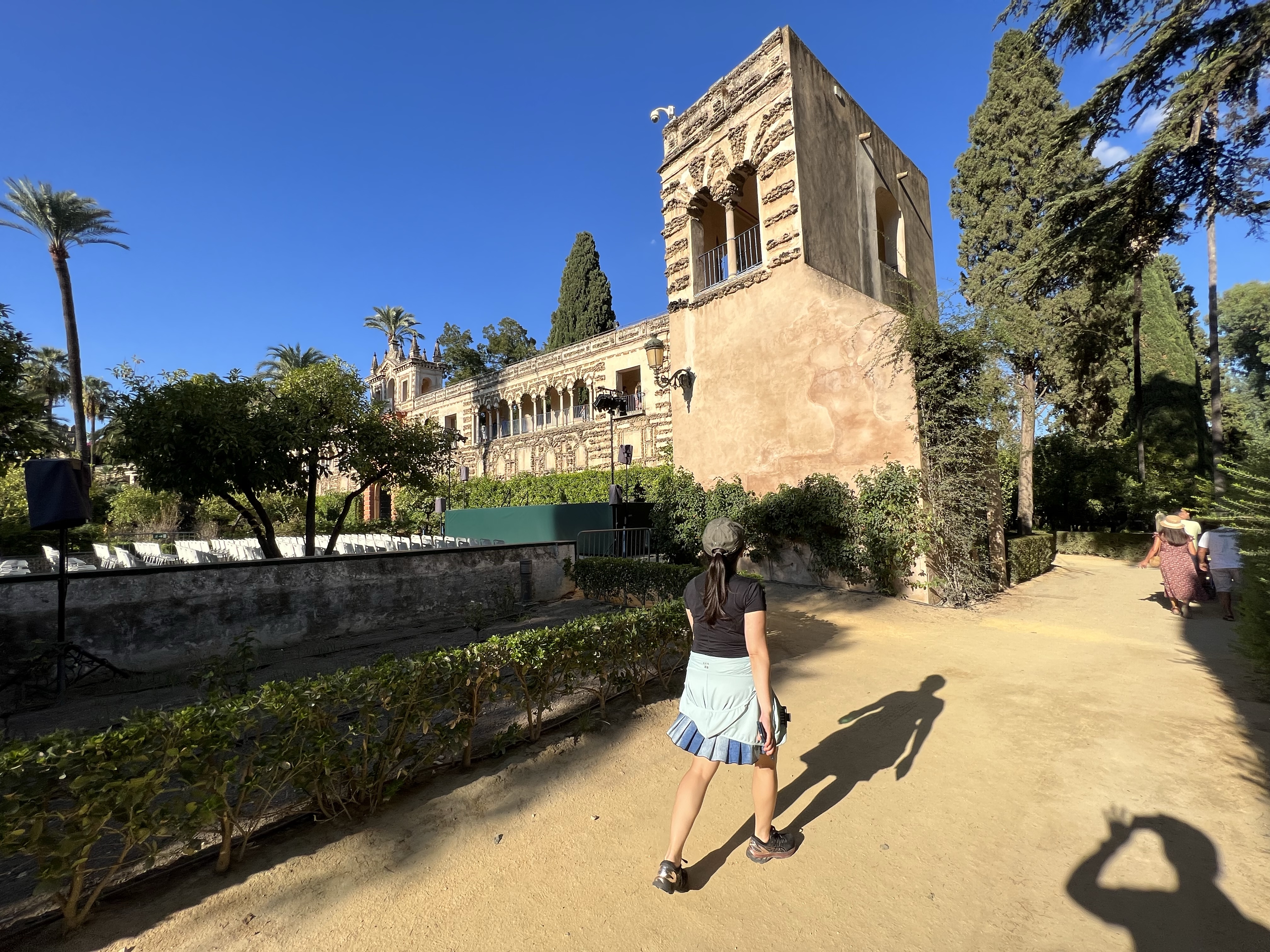 吃完蝦蝦,想說最後一天在西班牙了,去塞維亞皇宮走走,一開始走到皇宮的後側面,只看到高高的圍牆和沿著圍牆建起的一整排商店,繞了一大段路才找到入口,幸好買票跟主教座堂一樣方便,上網按一按就能進場。