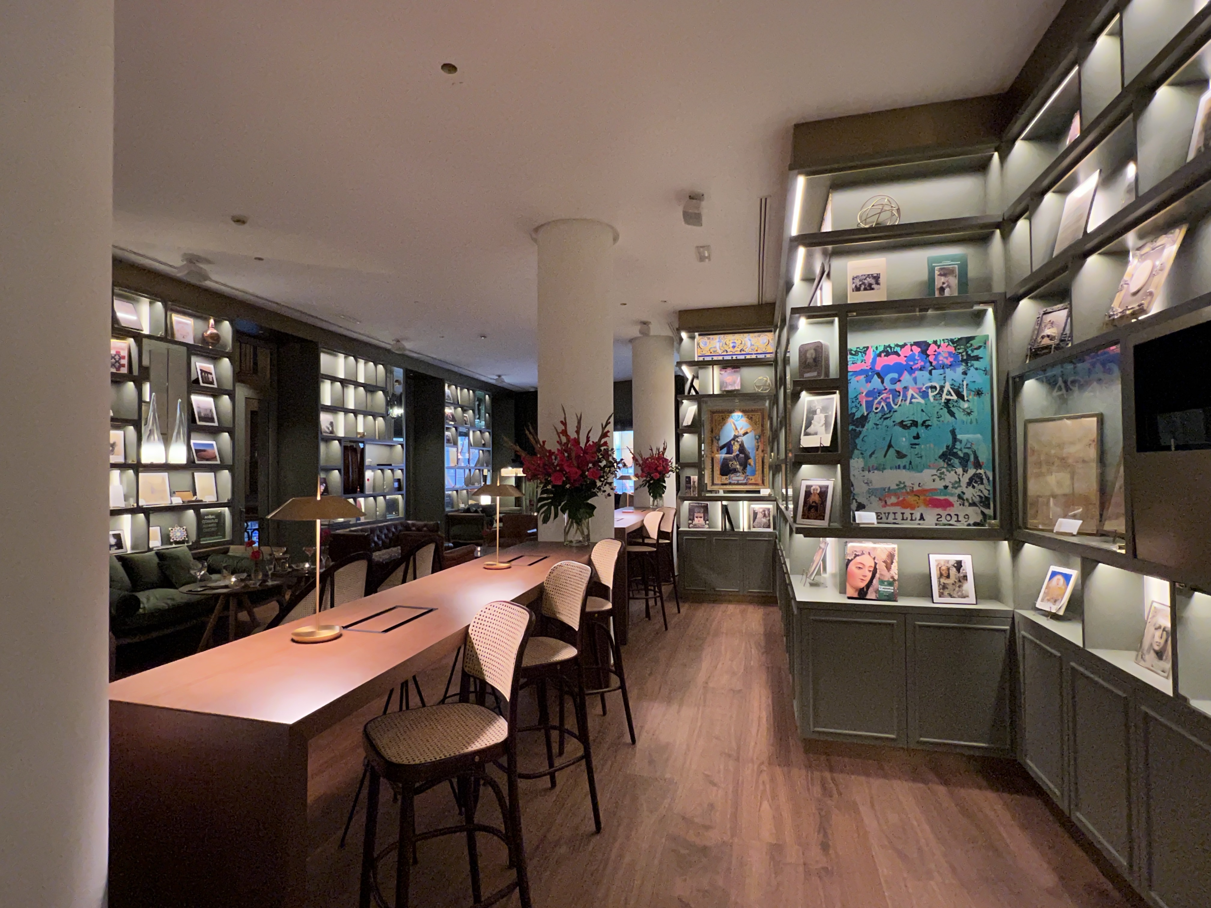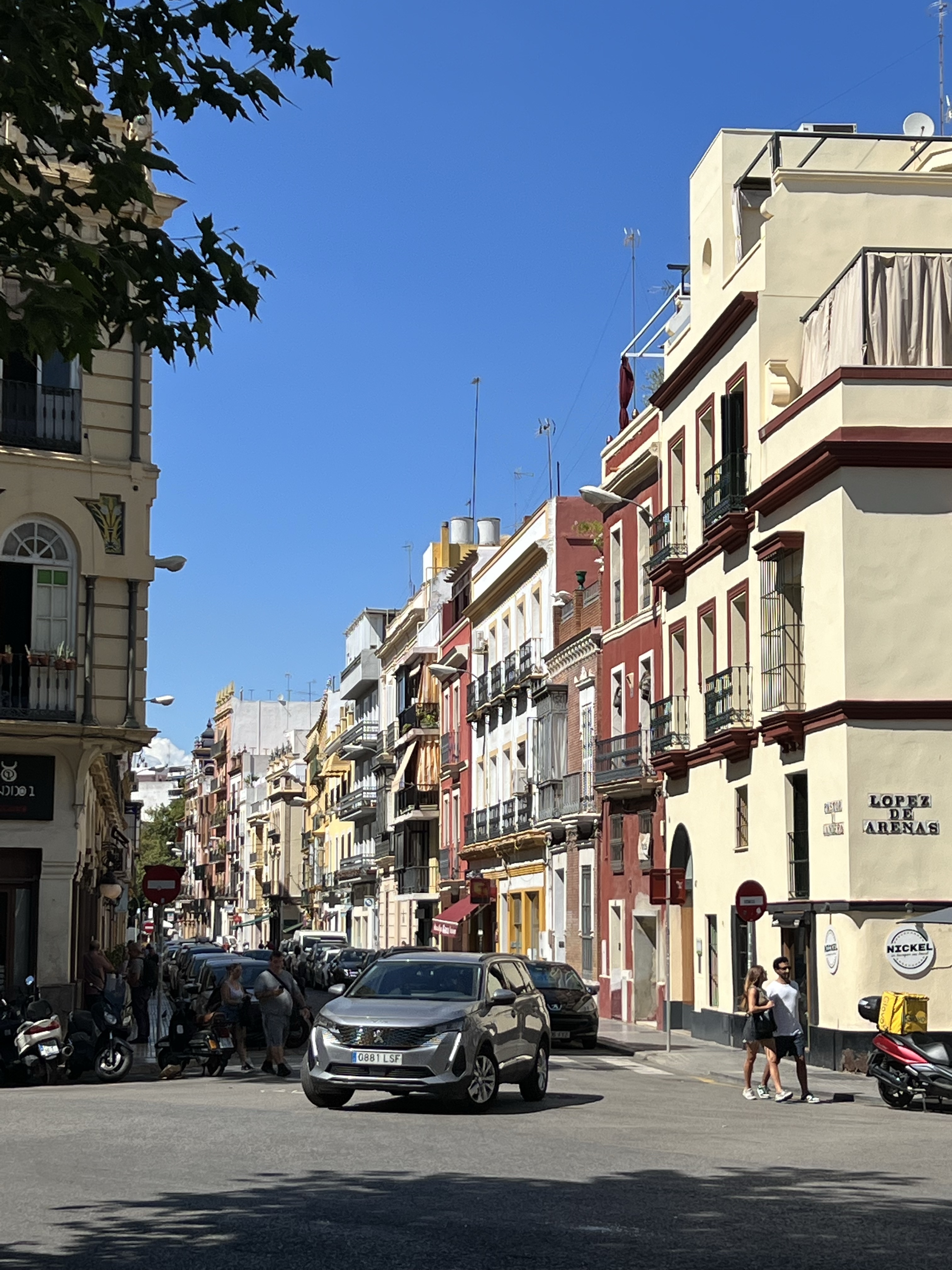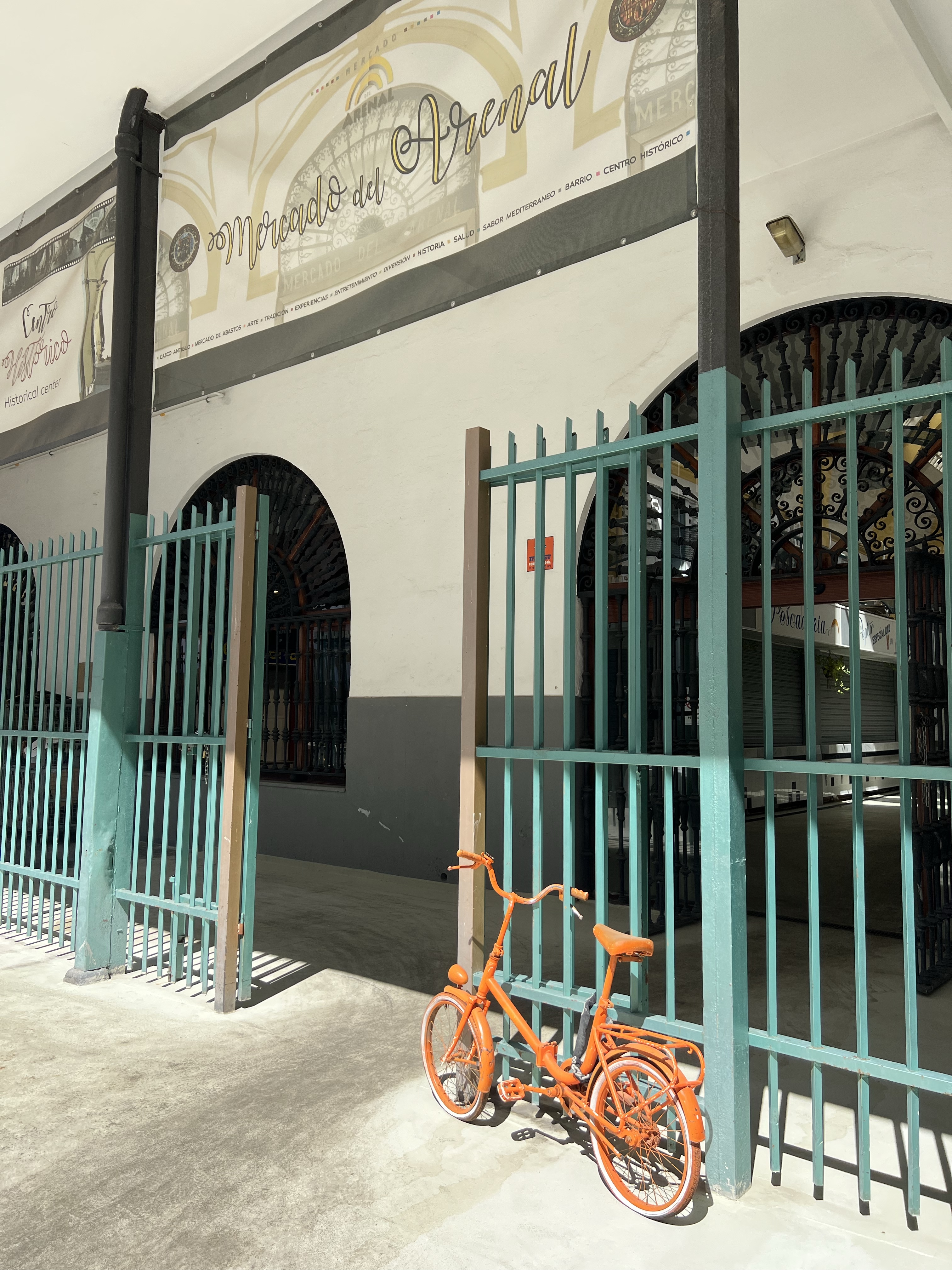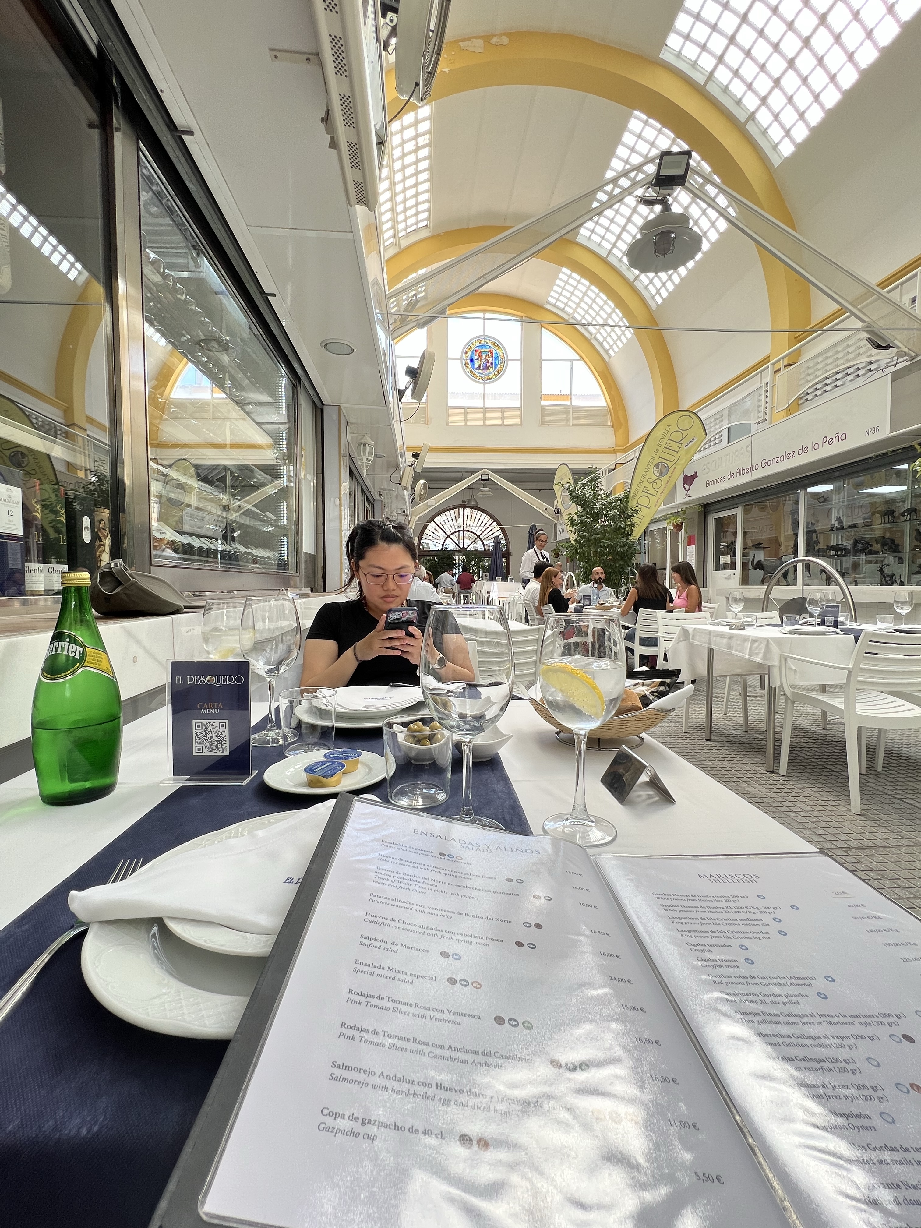 出門前想先回房間上個廁所,結果很不巧正在打掃,不想造成清潔人員困擾的我們兩個就在電梯口的沙發上窩著等待,順便看看前一天預定的餐廳有沒有成功。為了吃朝思暮想的緋紅大蝦,前一天就查到塞維亞有少數幾間餐廳有提供,其中一間還是米其林餐廳Cañabota,非常難訂位,只能安排候補;另外一間在市場裡的餐廳Pesquero則是回覆我下午三點有位子。突然有西班牙的電話打來,是Cañabota打來說下午兩點有位子要不要去,儘管很吸引人,但我們早餐真的吃太飽,下午兩點吃米其林實在太拼命,就維持原訂三點去市場吃個蝦就好。