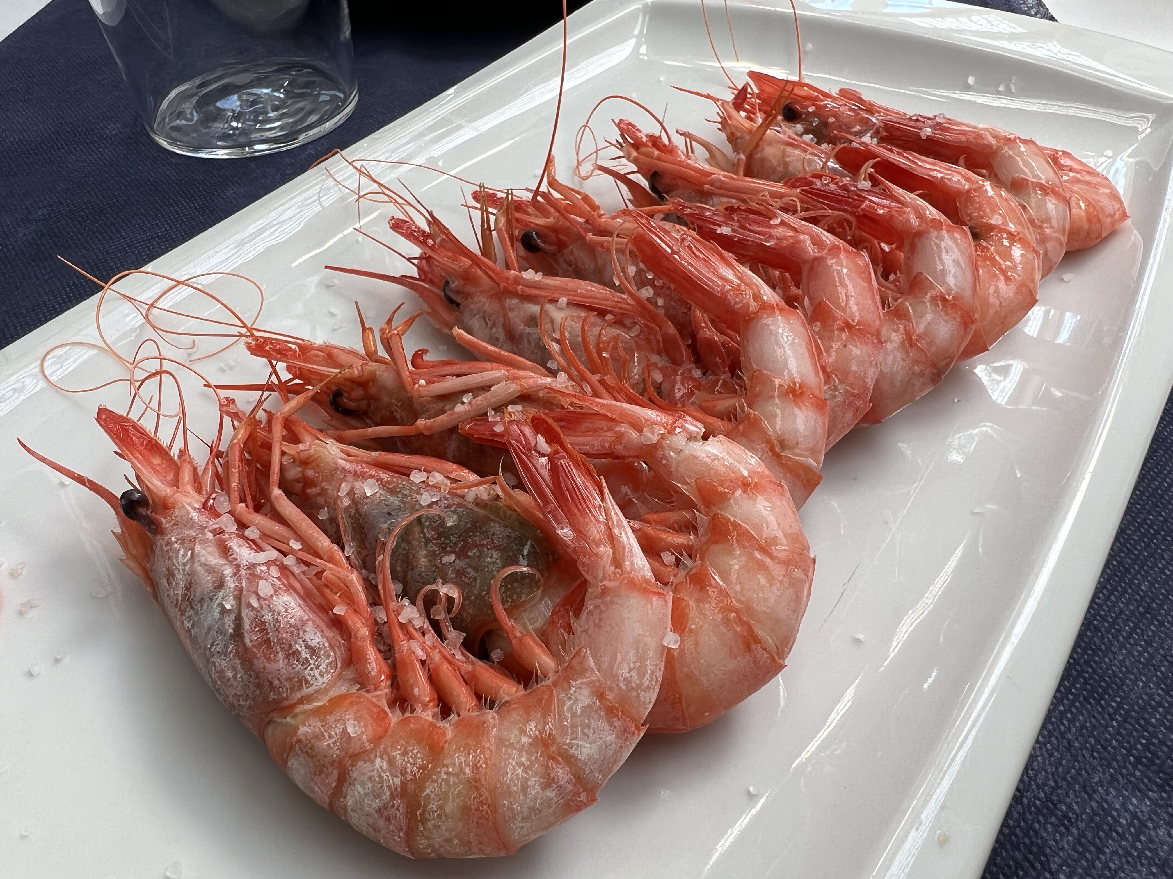 離開教堂後,興沖沖步行前往市場吃大蝦!市場就在河畔的鬥牛場旁邊,入口很隱晦,還好旁邊停了一台腳踏車,進去後幾乎所有的店都關了,可能真的是只有上午才開的市場,我們還懷疑走錯地方。走到餐廳發現還蠻多人的,室內的吧台更是一堆人在吃飯喝酒,我們坐在室外的位置,侍者大叔帶我們就坐後,進去拿了一整盤的各種活蝦出來,震驚到我都忘記拍照了!大叔介紹著每一種蝦子的特色和價錢,除了我們一眼就認得出來的緋紅大蝦carabinero之外,還有體型小一點的蝦子,大叔說那個跟緋紅大蝦類似,是西班牙南部海岸Almeria的特產,不過是整隻水煮的,如果是carabinero則是剖半用烤的,兩者價錢差不多(但還是比馬德里貴了三成),最後決定小的點八隻,大的點兩隻,吃爆!