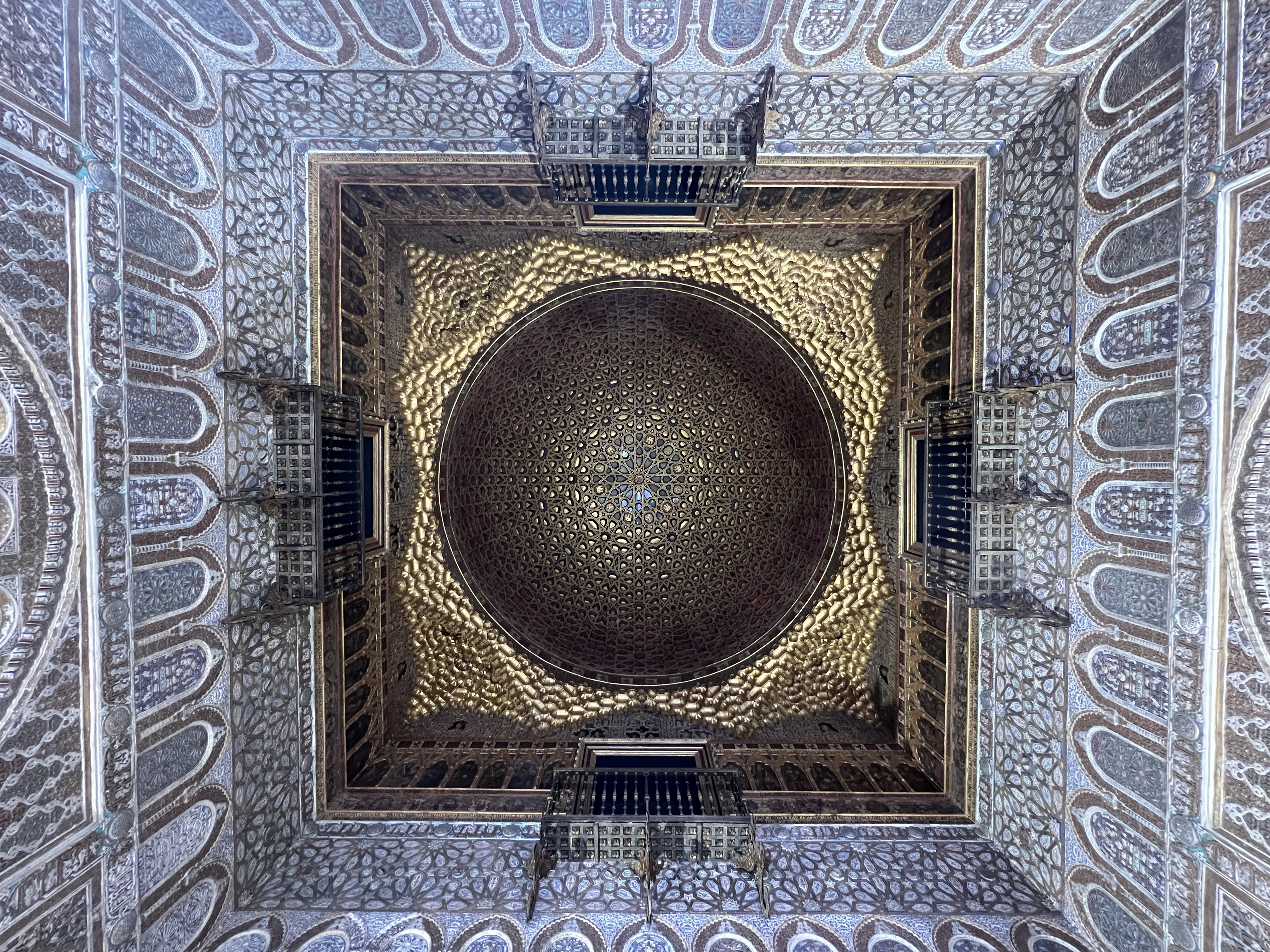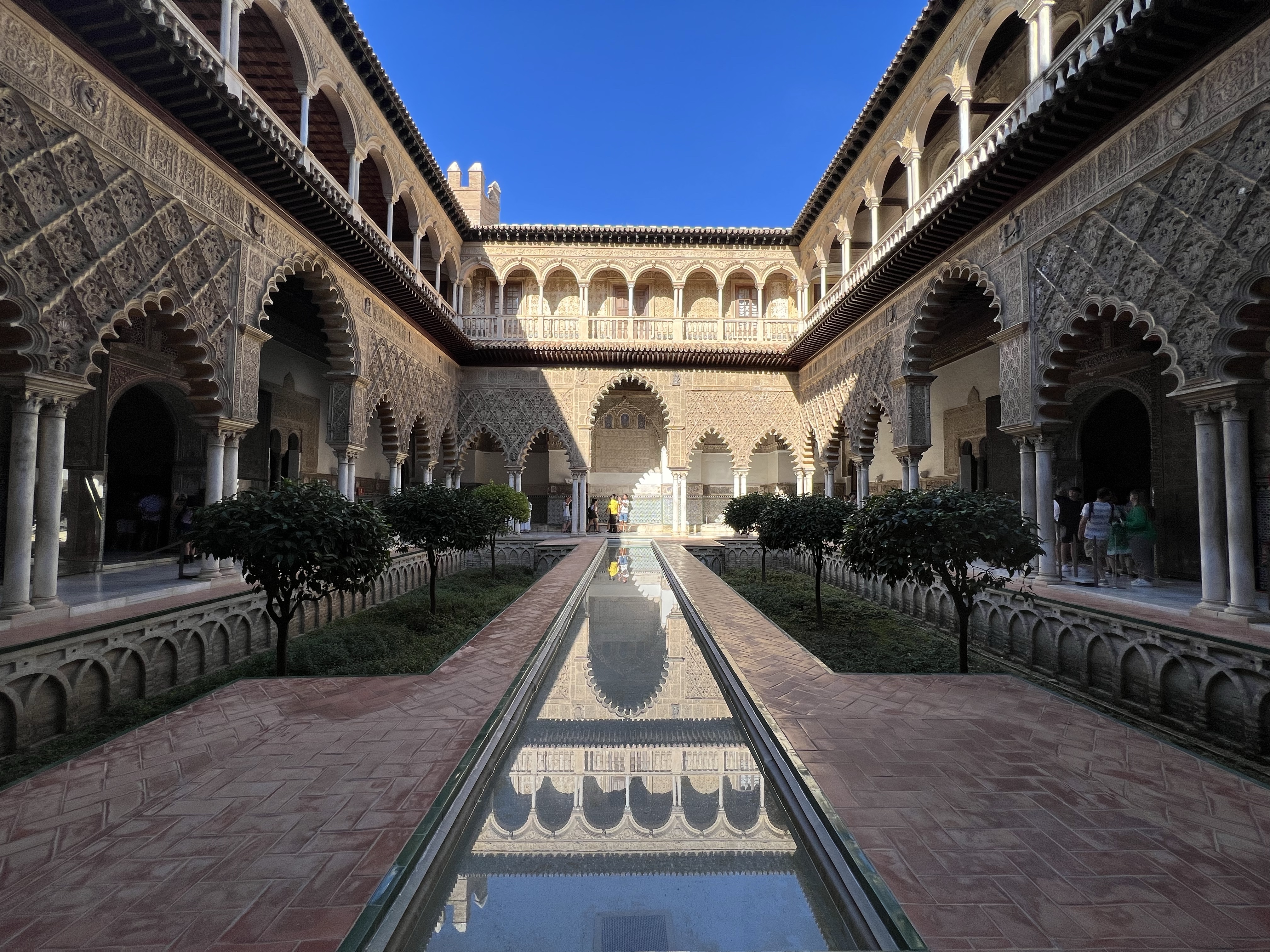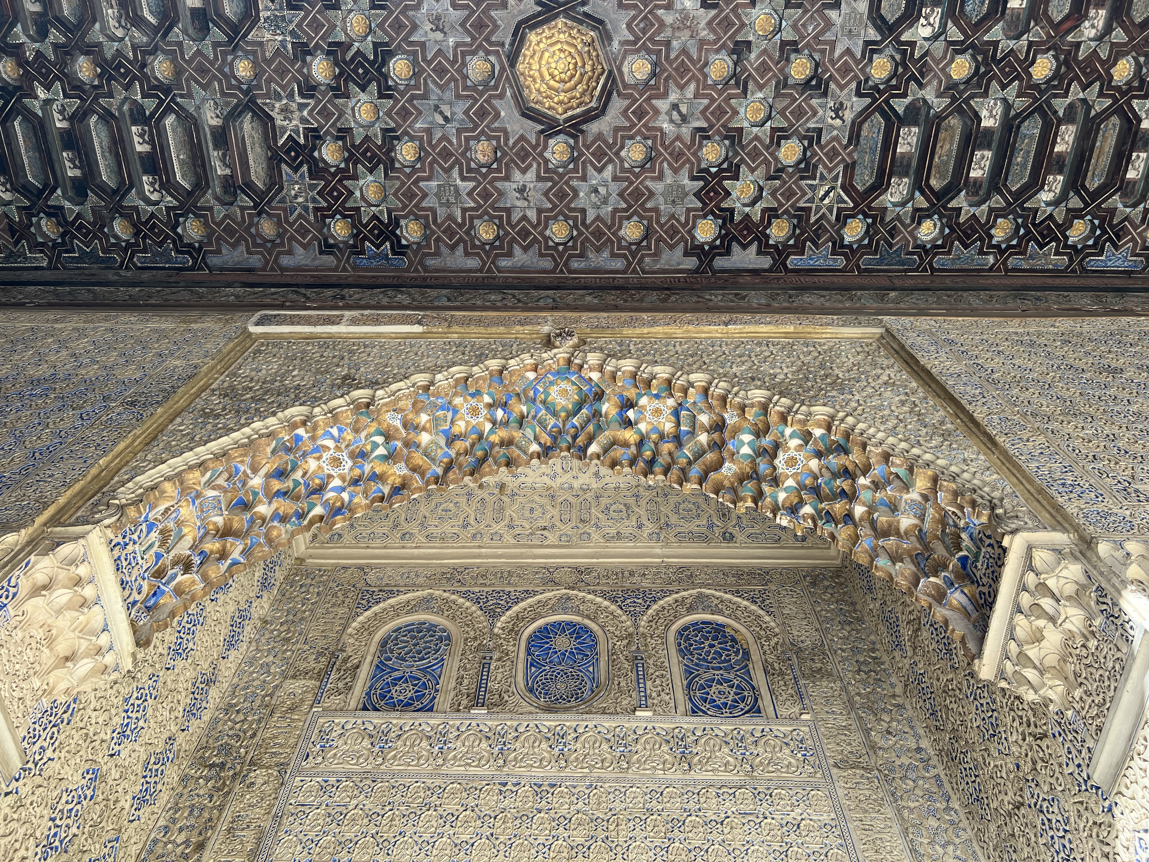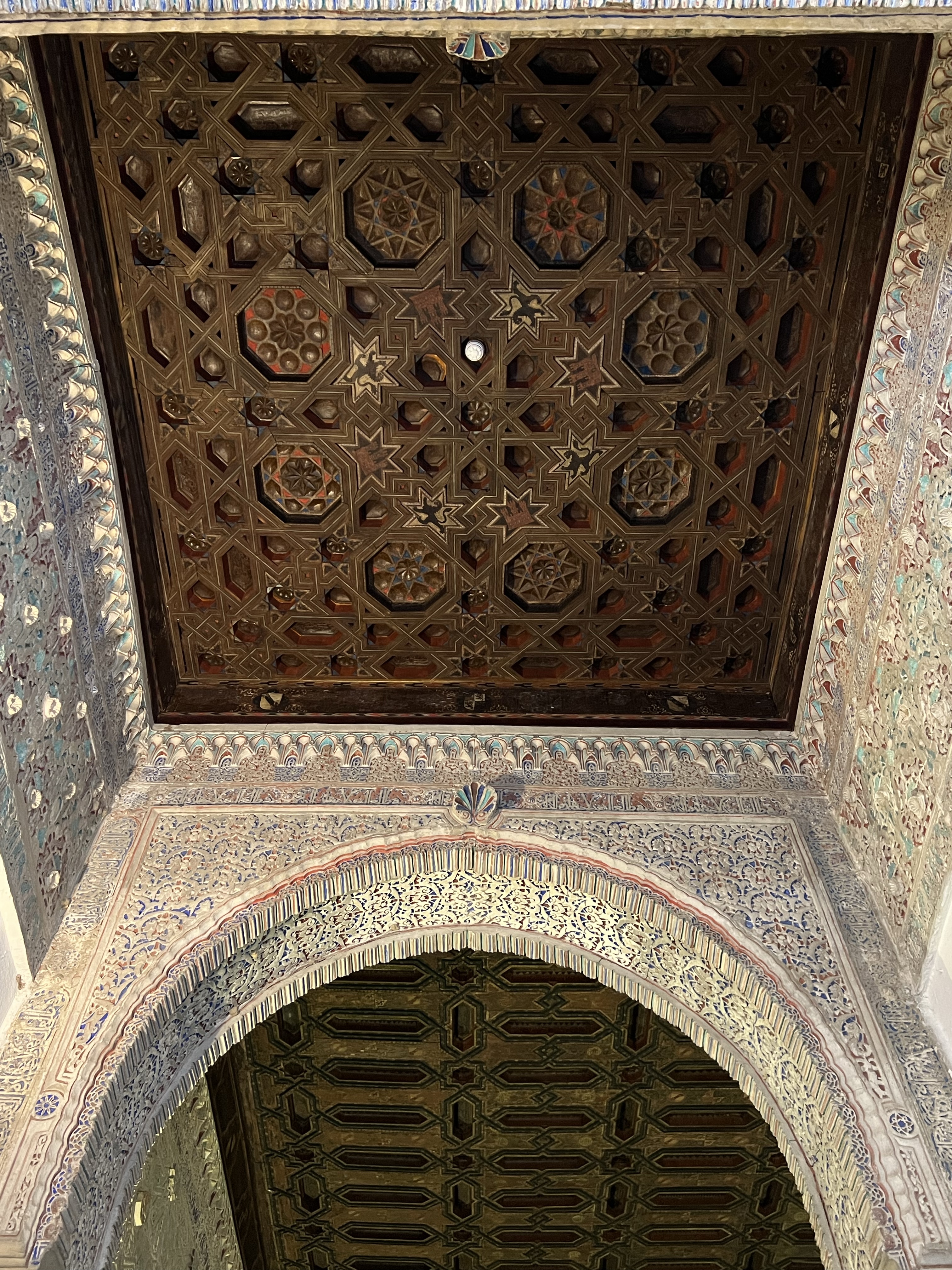 塞維亞皇宮就像是阿爾罕布拉宮的複製版,每座門每扇窗每個天花板的裝飾都有阿爾罕布拉宮的影子,也有非常類似的中庭水池。但真正精彩的在塞維亞皇宮加上了當年輝煌時期的彩繪,不單只是白白褐褐的石膏和木板,所以儘管看過阿爾罕布拉宮,塞維亞皇宮依然非常值得參觀。