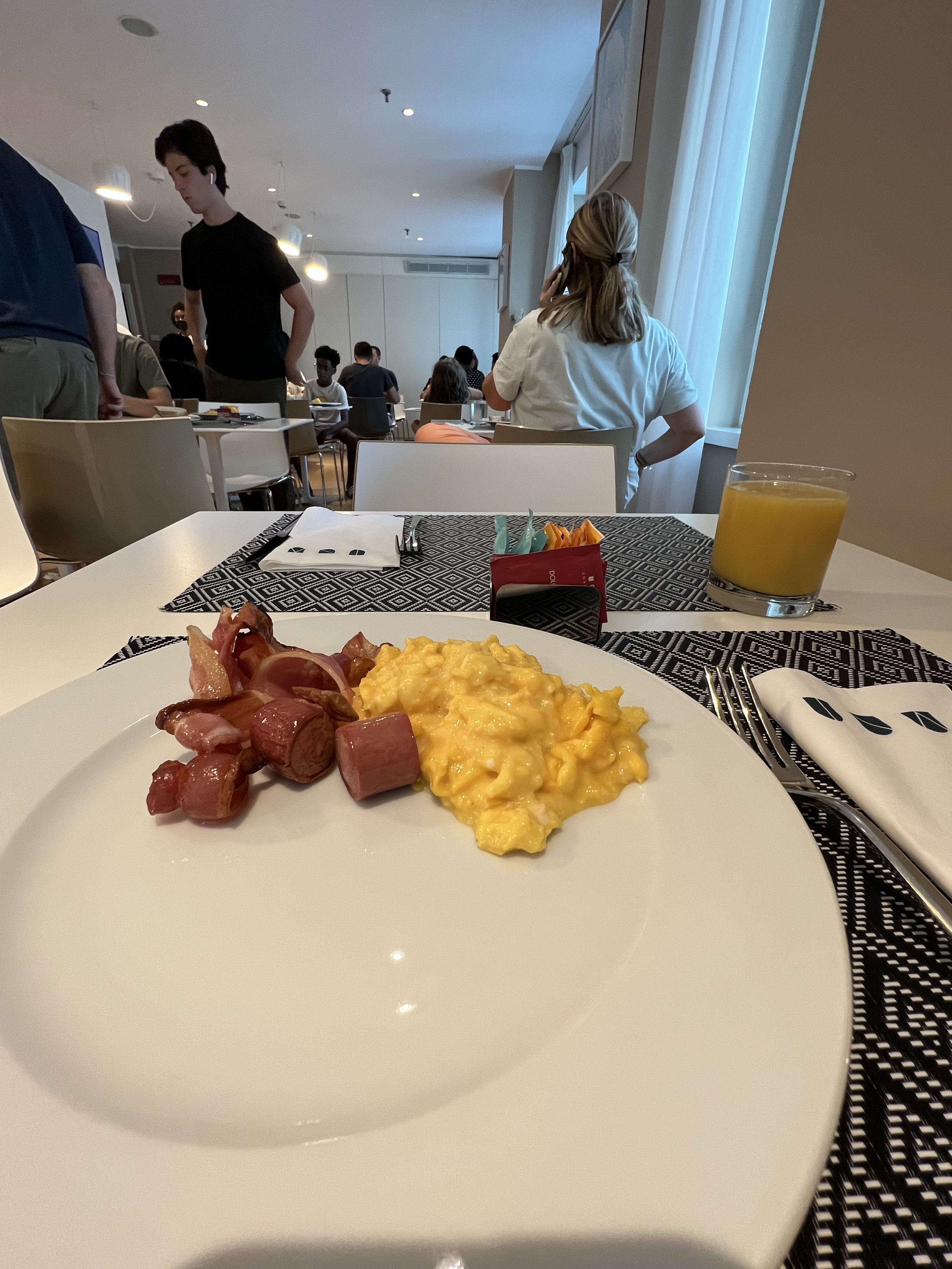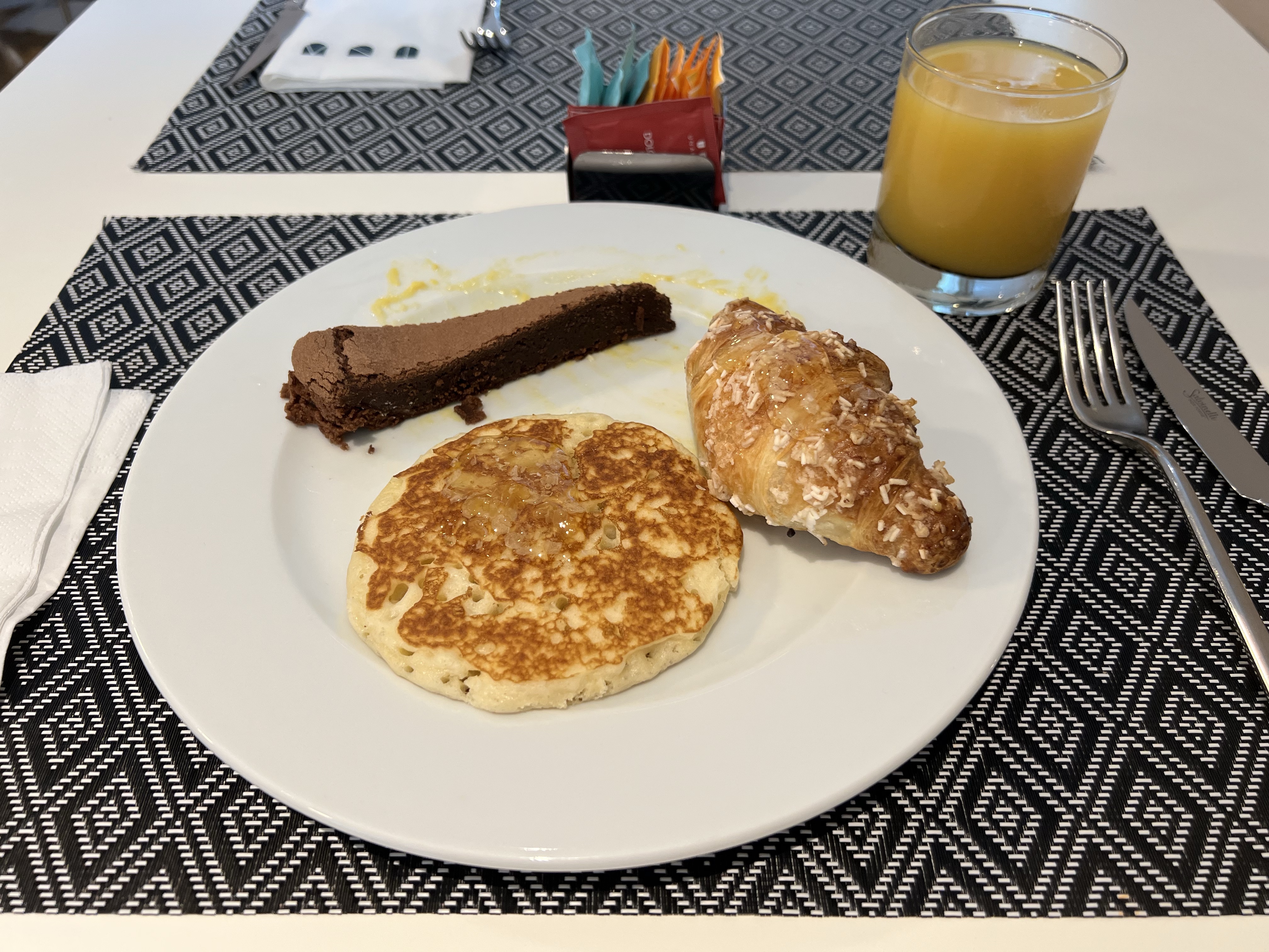 住在Bangkok Marriott Marquis Queen’s Park最期待的就是早餐了!早餐在Goji Kitchen+Bar裡用餐,全自助式,餐檯有夠多,大概就是五星飯店吃到飽的排場,分成很多區域的菜色例如:中式白粥小菜、印度式烤餅咖哩、西式臘腸炒蛋,還有現煮的煎蛋捲和麵食區等等,另外有麵包、客製鬆餅、乳製品、咖啡、水果。只是真的繞了一圈,有很多菜色實在不是我們會選來當早餐吃的,選擇雖多,卻還是拿了炒蛋、臘腸火腿、鬆餅、水果之類平常會吃的東西。